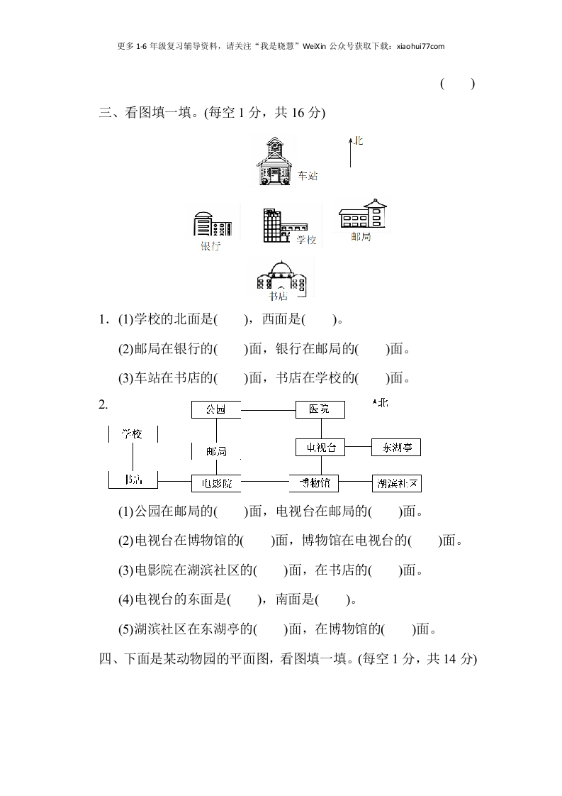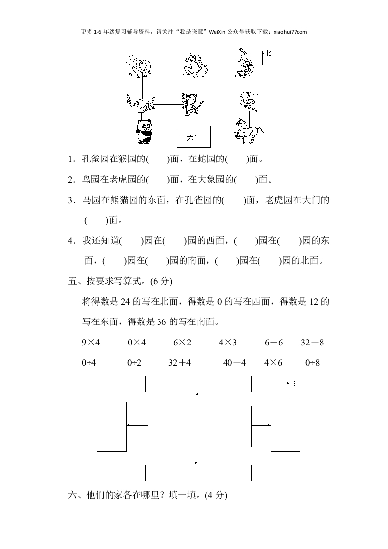 更多1-6年级复习辅导资料,请关注“我是晓慧”We议in公众号获取下载:xiaohui77com第六单元达标测试卷一、想一想,填一填。(每空1分,共20分)1.制作方向板。2.小明早上起来,迎着太阳做操,他的前面是(),后面是(左面是(),右面是()。3.地图或者平面图,通常是按()绘制的。4.夜晚当你面向北极星时,你的前面是(),后面是(),左面是(),右面是()。5.乐乐在小利的东面,那么小利在乐乐的()面。6.面向太阳,早晨时影子指向(),傍晚时影子指向(7.当你面向南时,你的前面是()方,后面是()方,左面是()方,右面是()方。二、借助生活经验来判断。(对的打“√”,错的打“X”)(每题2分,共8分)1.太阳东升西落。()2.贝贝家的窗户朝向南,因此终年不见阳光。()3.丽丽家在学校的西面,那么放学回家时她就要向东走。()4.早晨,如果你面向北,那么在你的右边太阳正冉冉升起。