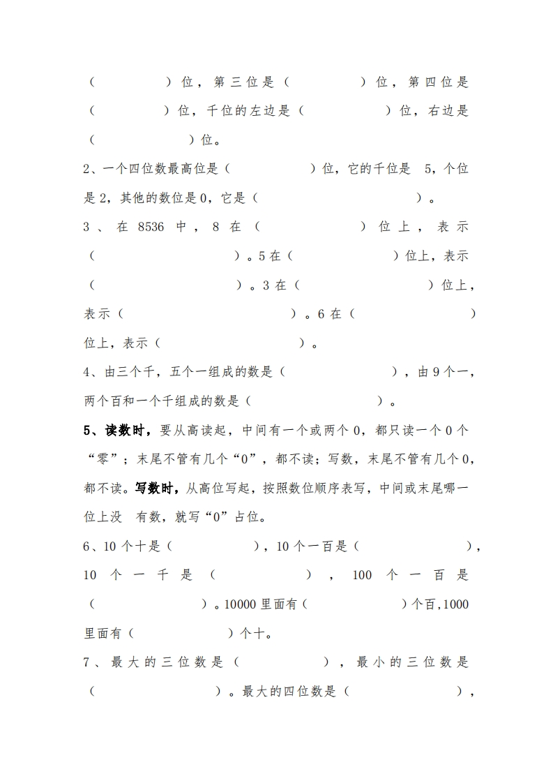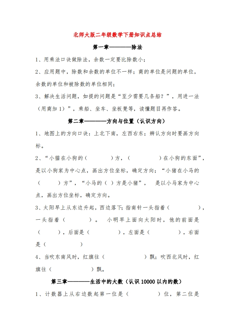北师大版二年级数学下册知识点总结第一章——除法1、用乘法口诀做除法,余数一定要比除数小;2、应用题中,除数和余数的单位不一样;商的单位是问题的单位,余数的单位和被除数的单位相同3、解决生活问题,如提的问题是“至少需要几条船?”,用进一法(用商加1)”,乘船、坐车、坐板凳等,读懂题目再作答。第二章——一一方向与位置(认识方向)1、地图上的方向口诀:上北下南,左西右东;辨认方向时要画方向标。2、“小猫在小狗的()方,()在小狗的东面”,是以小狗家为中心点,画出方位坐标,确定方向;“小猪在小马的()方”,“小马的()方是小猪”,是以小马家为中心点,画出方位坐标,确定方向。3、太阳早上从东边升起,西边落下;指南针一头指着(),一头指着()。小明早上面向太阳时,他的前面是(),后面是(),左面是(),右面是(4、当吹东南风时,红旗往()飘;吹西北风时,红旗往()飘。第三章一一一生活中的大数(认识10000以内的数)1、计数器上从右边数起第一位是()位,第二位是