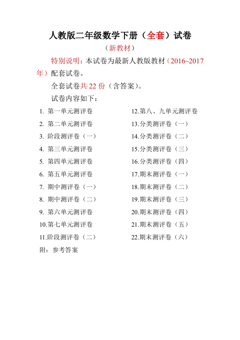 人教版二年级数学下册(全套)试卷(新教材)特别说明:本试卷为最新人教版教材(2016~2017年)配套试卷。全套试卷共22份(含答案)。试卷内容如下:1.第一单元测评卷12.第八、九单元测评卷2.第二单元测评卷13.分类测评卷(一)3.阶段测评卷(一)14.分类测评卷(二)4.第三单元测评卷15.分类测评卷(三)5.第四单元测评卷16.分类测评卷(四)6.第五单元测评卷17.期末测评卷(一)7.期中测评卷(一)18.期末测评卷(二)8.期中测评卷(二)19.期末测评卷(三)9.第六单元测评卷20.期末测评卷(四)10.第七单元测评卷21.期末测评卷(五)11.阶段测评卷(二)22.期末测评卷(六)附:参考答案