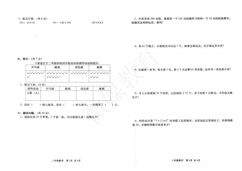 2018-2019学年度第二学期期末测试卷2、18个草果,平均分给6个人,每人最平均分得(》个。二年级数学A.2B.3C、4题序五得分3、最大四位数与最大三位数相差(得分A,9000B、999C,1阀卷人4、有0块饼千,最少拿走()块,可以使器个小朋友分得的铺干一样多。A、3B、10C、2温馨提乐:本试卷满分100分,考试时间90分针5、把3+6-99×8=72合并成一个算式是()。一、我会填。(每空1分,共30分)A、3+6×8B、3×8+6C.(3+6)×81,5306是()位数,最高位是(),这个数读作(么6、下列各数中一个零都不读的是(。A、45002.42÷8=()t:(),除数是(),被称数是(B、4005C、4050》,余数是(商是《)7、从63里面连装减9,就()次结果是0。A,7B.8C,93,3458是由《)个千、(》个百、.()个十和()个一一组成。8、有红球。白球、黑球三种球,小红、小明、小强各拿一种,小红说:“我拿的4、在括号里填上合适的单位,是红球”,小明说:“我拿的不是白球”,小强拿的是()。小红体重约26()一块橡皮的重20(A,红球B,白球C、黑球5,6000的前一个数是(),后一个数是《).、“相国在我心中祖国在我心中相国在我心中”第26的个学是(6,6千克-()克3000克+2000克-()千克A、我B、心C,国7、与6000相邻的两个数是()和().10、下面(》是轴对称图形8、18个☆,每5个女分一粗,可以分()组,还剩()个9、写出两道用口诀“四九三十六”计算的除法算式:(四、我会算。(共24分)10,括号里最大能填儿?1、直接写出得数。(10分)()×7<506×()<49()×9≤6549+77×9-3300+3000-540-407+711、电风扇转动是()现象,神舟飞船发射升空是()现0÷97000-3000=500+5000=8×040+5二、我会判。(对的打“”错的打“”,共5分)2、用经式计算。(共8分)1、在有余数的除法里,余数一定要比商小。30+4=48÷976÷842÷7=2,76一25一18与76一(25+18)的运算膜序不同,结果相同.()3、统计数据时必须用商正字的方法。4、最大的四位数是9999,最小的四位数是1111:()5、3000克铁比3千克棉花重三、我会违。(每题1分,共10分)1,9063>90口2,口里最大能填(A、5B、6C,9二年极数牛第1天共4页二年最数学幕2页共4页