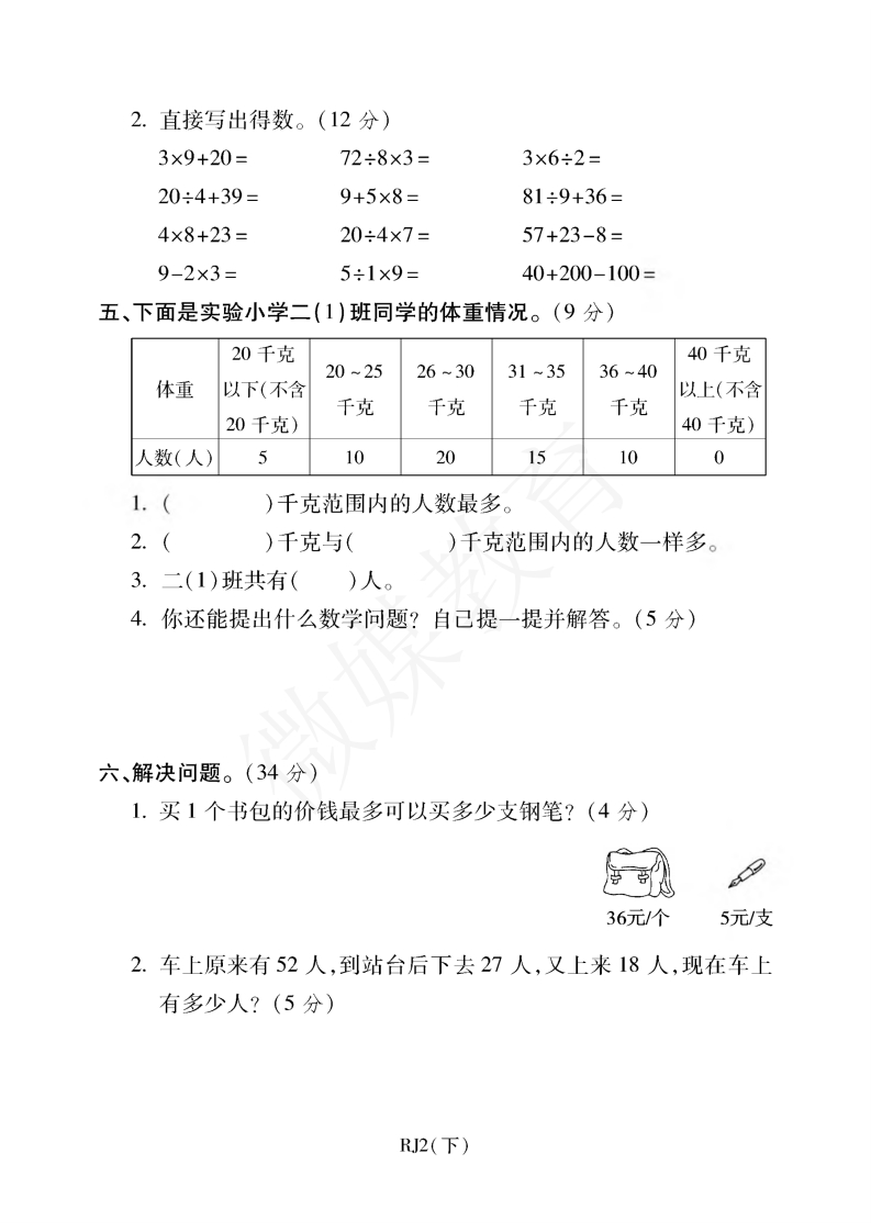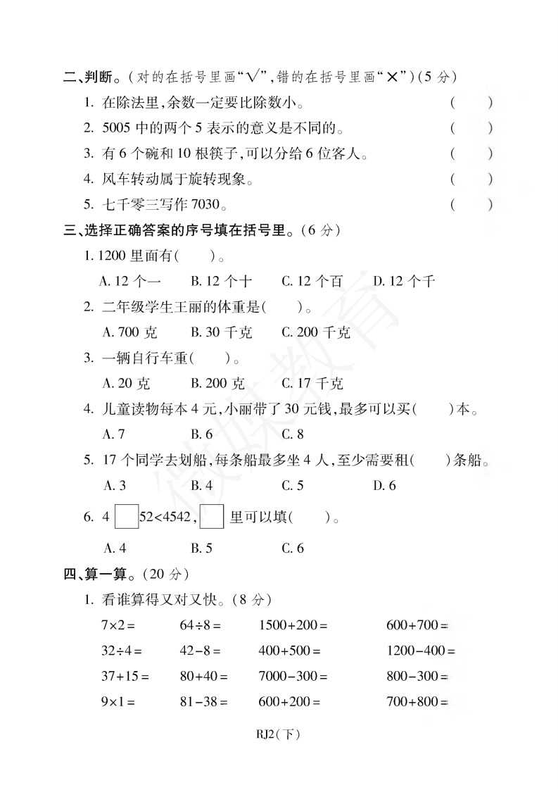 ·百所名校试题调研期末考试全真模拟训练卷国食倒@圈(二)题号二三四五六总分得分一、填一填。(26分)》1.一个数,百位上是7,千位上是2,其余各位上的数字都是0,这个数是(),读作()。2.有17个羽毛球,平均分给5个班,每班分得()个,还剩()个。3.计算8×(5+4)时,先算()法,再算()法。4.在○里填上“>”“<”“=”或“+”“-”“×”“÷”05○5=153○35=186○18÷3354×97○9=638○8=164(○15÷5990克○1千克5.15÷3=(),表示把()平均分成()份,每份是();也表示15里面有()个()。6.马=()克Q=()克7.按从重到轻的顺序排列。(3分)3900克4千克1900克4100克90克9千克8.一根绳子长20米,对折以后再对折,每段长()米。RJ2(下)