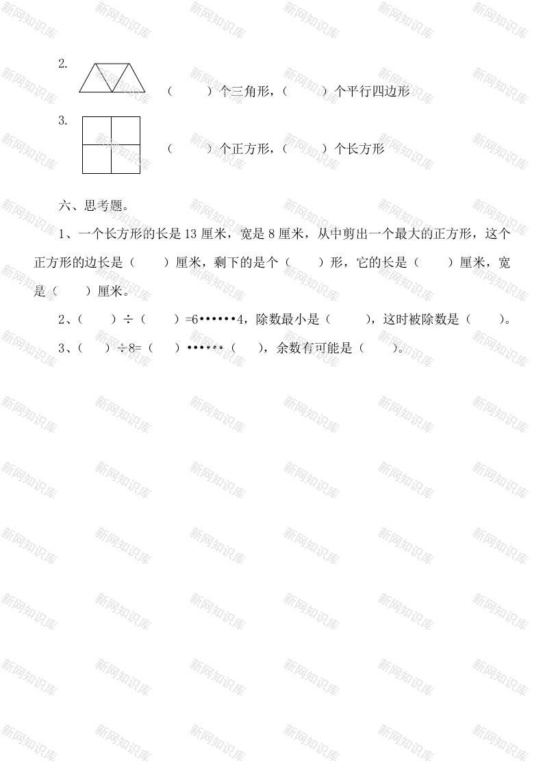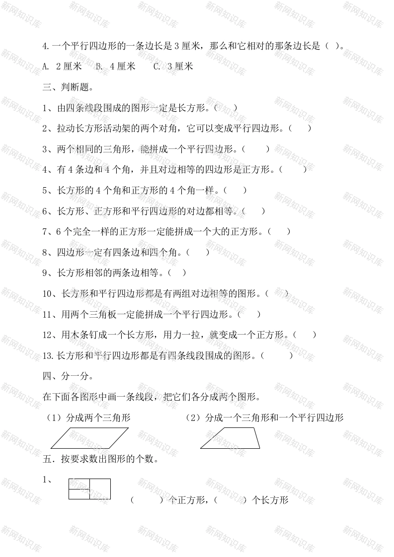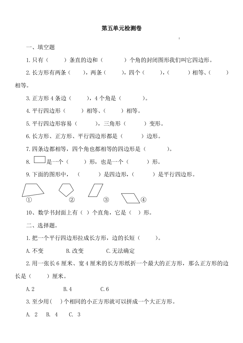 第五单元检测卷一、填空题1.只有()条直的边和()个角的封闭图形我们叫它四边形。2.长方形有两条(),两条(),四个(),()相等、(相等。3.正方形4条边(),4个角是()。4.平行四边形()相等、()相等。5.平行四边形容易(),三角形()变形。6.长方形、正方形、平行四边形都是()边形。7.四条边都相等,四个角也都相等的四边形是(8.是一个()形,也是一个()形。9.下面的图形中,()是四边形,()是平行四边形。②③10、数学书封面上有()个直角,它是()形。二、选择题。1.把一个平行四边形拉成长方形,边的长短(A.不变B.改变C.无法确定2.用一张长6厘米、宽4厘米的长方形纸折一个最大的正方形,那么正方形的边长是()厘米。A.2B.4C.63.至少用()个相同的小正方形就可以拼成一个大正方形。A.2B.4C.3