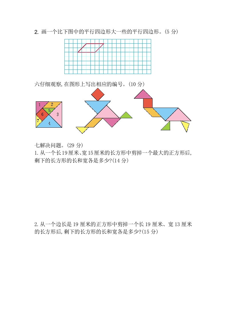 第五单元评估时间:60分钟满分:100分分数:一下面的四边形中,哪些是长方形?哪些是正方形?哪些是平行四边形?把相应的序号填在下面的圈中。(18分)长方形正方形平行吨边形二找一找,描一描。(12分)描出3个长方形描出?个正方形描出个平行四边形三想一想,在正确答案后面的☐里画“√”。(10分)下面的正方形被挡住的是什么角?铣角☐直角☐钝角☐用下面哪根小棒能与上图拼成一个长方形?6厘米4厘米2厘米6厘米?厘米四填一填。(12分)图形边的特点角的特点长方形正方形平行四边形五小画笔。(9分)1.在方格纸上画一个正方形和一个长方形。(4分)