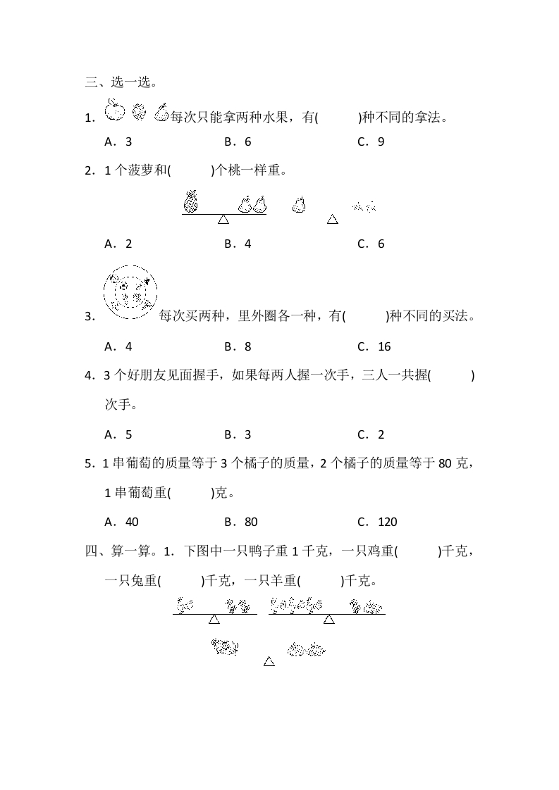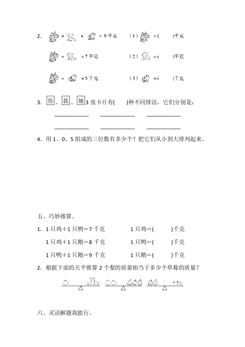 第八单元检测卷及答案一、想一想,填一填。1.用3和7两个数字可以组成()个不同的两位数,它们分别是)和(2.小丽有三条裙子和两双鞋,她有()种不同的搭配方法。3.红红和弟弟、妹妹一起去照相,如果红红站在中间,可以照(张不同的照片;如果没有规定,可以照()张不同的照片。4.小红、小丽、小强3人进行羽毛球比赛,排名结果有(种可能。5.用数字5,0,6可以组成()个不同的两位数,它们分别是),还可以组成)个不同的三位数,它们分别是6.1筐苹果的质量等于2筐梨的质量,2筐梨的质量等于4筐樱桃的质量,2筐苹果的质量等于()筐樱桃的质量。二、我是聪明的小法官。1.用数字9和0可以组成2个不同的两位数。()2.4名同学参加植树活动,每2名同学一组,可以有2种分法。()3.三个小朋友每人玩一辆碰碰车,如果每两人碰一次,一共要碰3次。()】4.0十0十0十△十△=14,△=0十0,则0=2。()5.小明、小红和小芳在联欢会上排成一行表演小合唱,他们有3种排队方法。