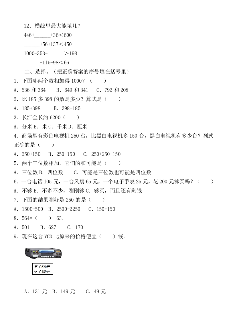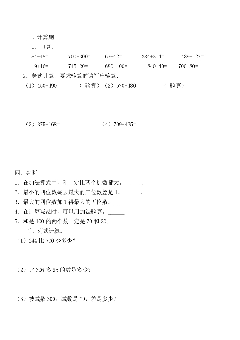 第六单元检测卷(A)一、填空。1.甲数是216,乙数是67.这两个数的和是,差是2.最大的三位数与最小的两位数的和是差是3.在横线里填上“>、=、<”。125+276400420+137586420+137586725900-126780+95800740-2965004.把下列算式按得数大小,从小到大排成一行。234+14501-196690-208236+1455.算出每张卡片上的两个数的和与差。65741280528826998和和和差差」差6.笔算加、减法时,要对齐。哪一位上相加满十,要向位进哪一位上不够减,要从位退再减。验算加法时,可以用减去看是不是等于验算减法时,可以把和相加,看是不是等于。7.40厘米=分米7米=厘米1500米+500米=千米1吨-400千克千克8.+63=245362-=54260=123375=+1659.根据370+460=830,可以写两道减法算式:分别为:和10.小民身高110厘米,小红身高139厘米,小民比小红矮厘米。11.小熊猫体重125千克,小老虎体重比小熊猫多55千克,小老虎体重千克。