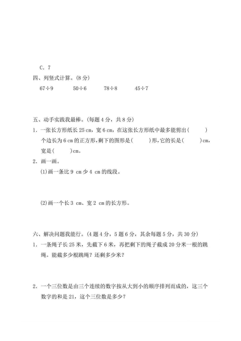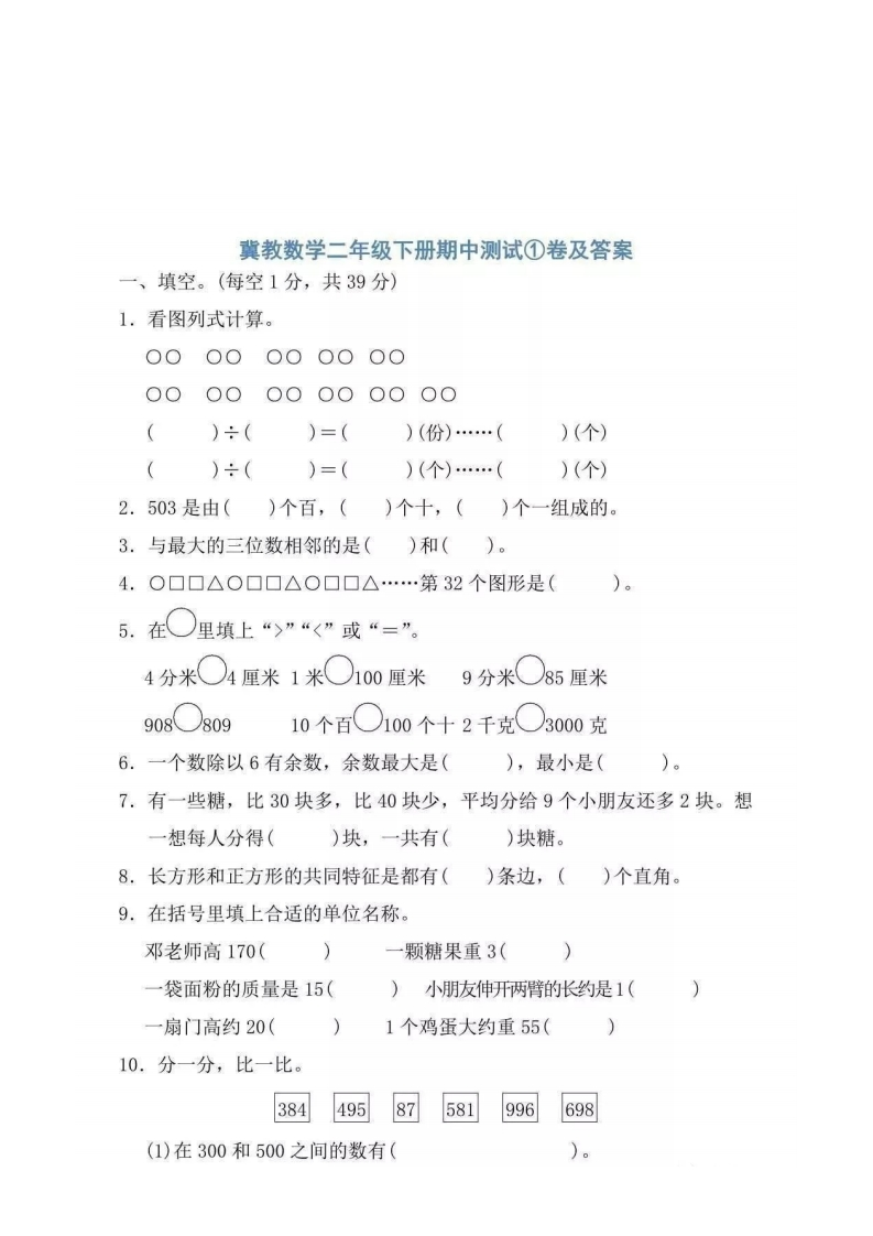 冀教数学二年级下册期中测试①卷及答案一、填空。(每空1分,共39分)1.看图列式计算。0000OOOOOOOOOOOOOOOO OO)÷()=()(份)…()(个)()÷()=()(个)…()(个)2.503是由()个百,()个十,()个一组成的。3.与最大的三位数相邻的是()和()。4.O☐☐△O▣▣△O☐☐△…第32个图形是()。5.在○里填上“>”“<”或“=”。4分米○4厘米1米100厘米9分米(○85厘米908○80910个百○100个十2千克○3000克6.一个数除以6有余数,余数最大是(),最小是(7.有一些糖,比30块多,比40块少,平均分给9个小朋友还多2块。想一想每人分得()块,一共有()块糖。8.长方形和正方形的共同特征是都有()条边,()个直角。9.在括号里填上合适的单位名称邓老师高170(一颗糖果重3(一袋面粉的质量是15()小朋友伸开两臂的长约是1(一扇门高约20(1个鸡蛋大约重55()10.分一分,比一比。38449587581996698(1)在300和500之间的数有(