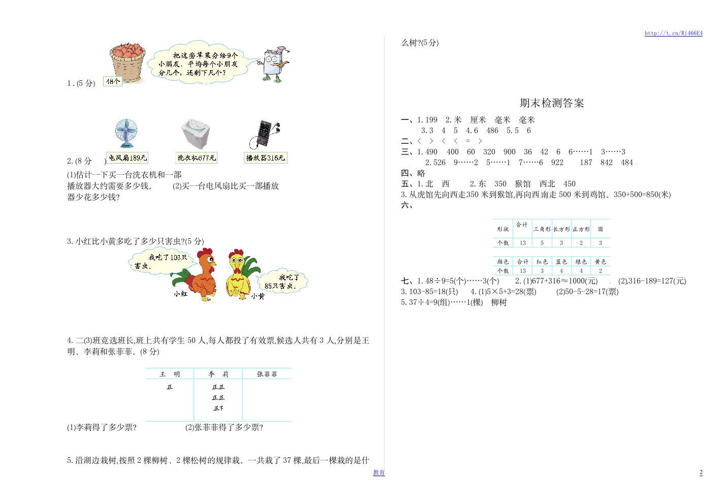 http://t.cn/Ri466E42016-2017学年下学期重点小学二年级期末检测卷2.量出下面两条线段的长度,并在比较长的线段后面的口内画“()厘米口班级:姓名:满分:100分考试时间:90分钟,毫米口五、看图填空。(10分)题序第一题第二题第三题第四题第五题第六题第七题总分鸟铝得分的馆350米350米猴馆虎馆一、填空题。(12分)熊馆500米380米Q-1.最大的两位数和最小的三位数的和是(2.在括号里填上合适的长度单位鸡馆三层楼房高10()一支铅笔长16()豪馆兔馆曲别针长25(语文书厚度大约是10(1.鸟馆在猴馆的()面猴馆的()面是熊馆.3.一个长方形,沿一条直线剪去一个角,可能有()个角,也可能有()个角,还可能有2.从熊馆出发去狗馆可以先向()走()米到.(),再向()走()米到狗(个角.馆.4.54是9的()倍54的9倍是(3.说一说从虎馆到鸡馆最近的路线,再算一算路程是多少米。5.在548<口49中,▣里最小能填(在714>口85中,里最大能填().二、在○里填上“>”.“<”或“=”。6分六、把下面的图形按不同标准分类。(10分)】O△986100040329935毫米20厘米53757380个十○10个80600厘米6分米三、计算题。(26分)1.直接写出得数。(10分)合计个数550-60=420-20=120-60=230+90=600+300=9×4=6×7=30÷5=19÷3=15÷4=2.列竖式计算。(16分)合计167+359=38÷4=36÷7=69÷9=个数675+247=605-418=485+357=1000-516四、操作题。(5分)1.在方格图上画一个直角、一个锐角和一个钝角七、解决问题。31分)数直