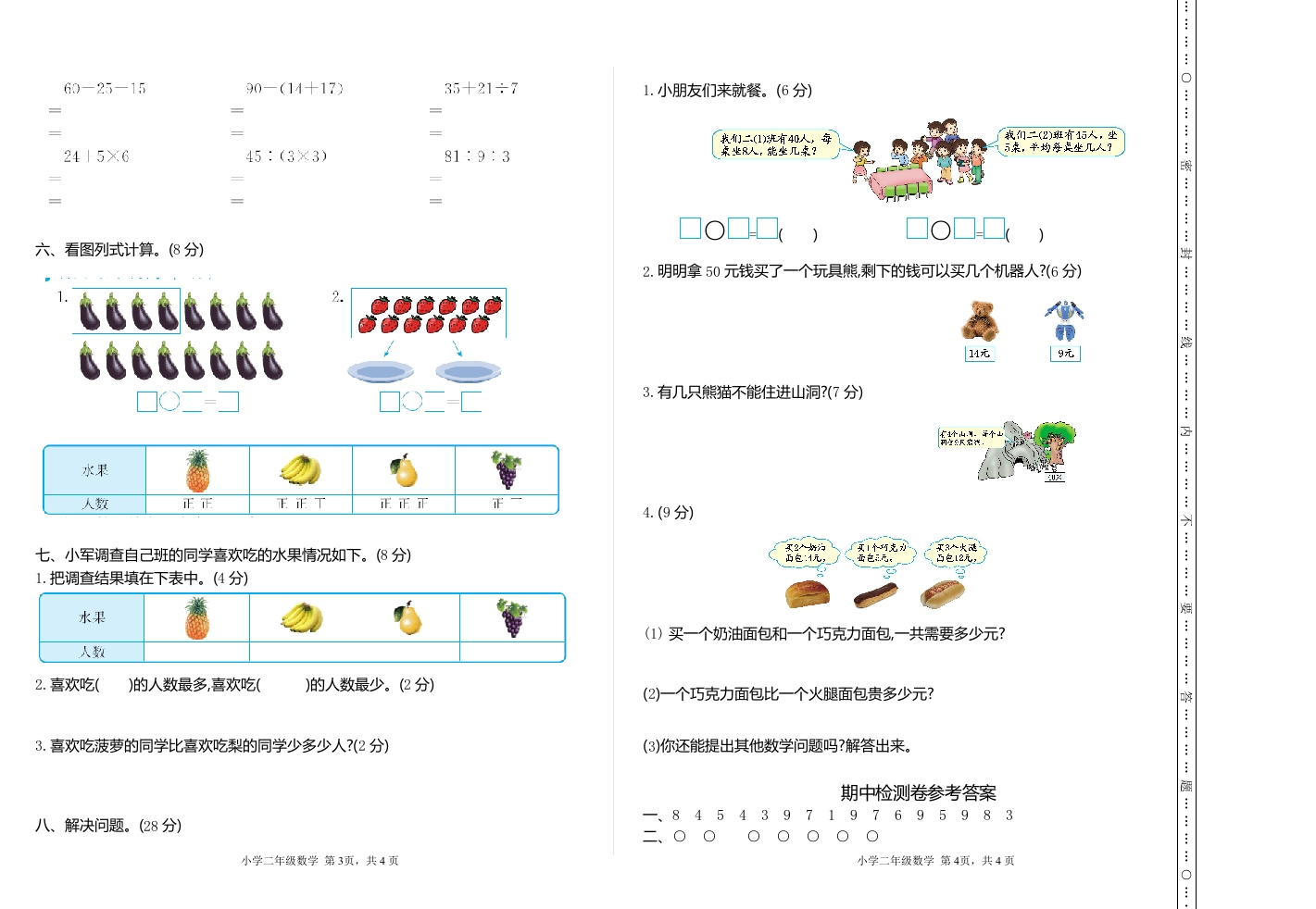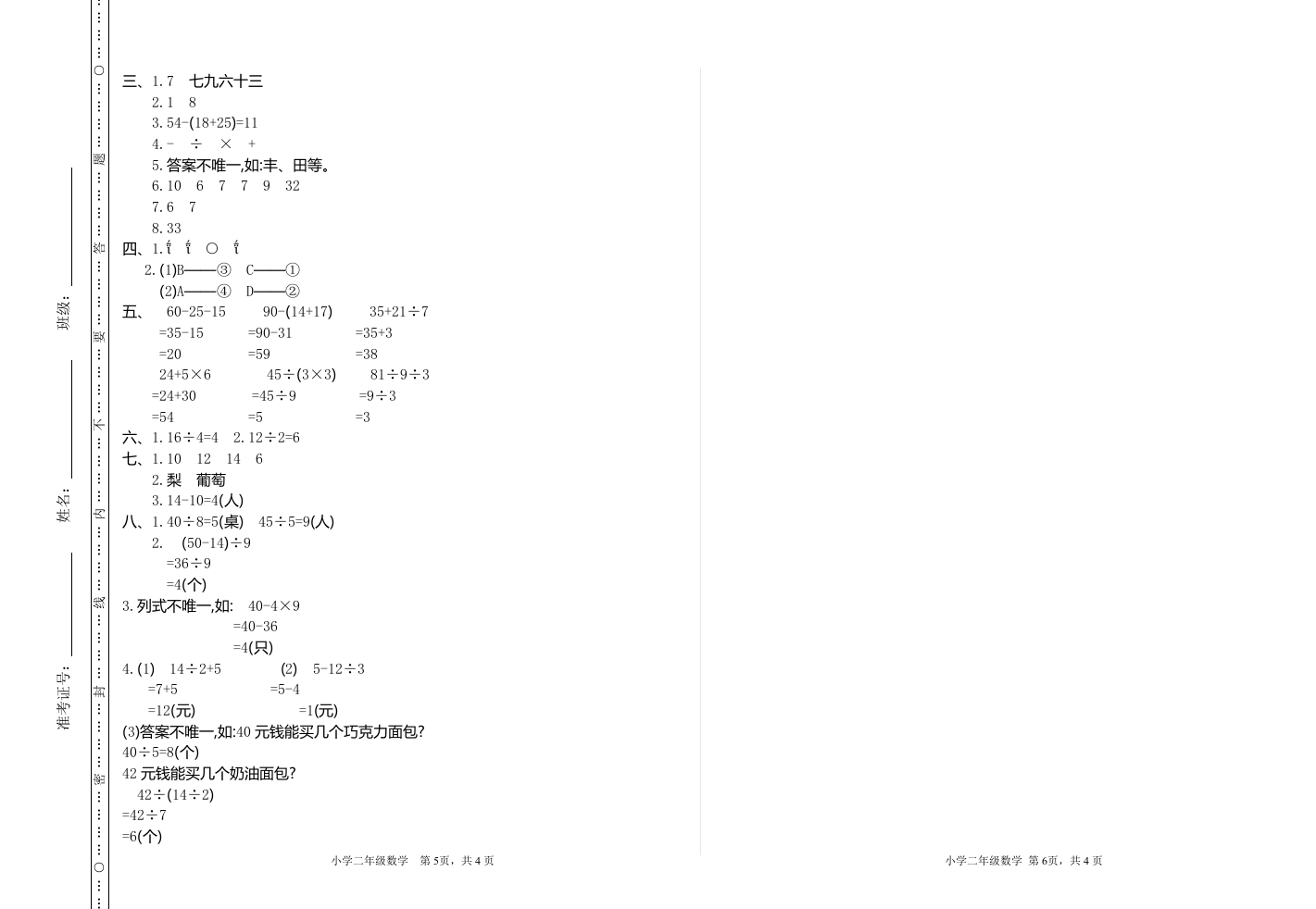 ::2020-2021学年下学期重点小学二年级期中检测卷5.写出两个具有对称特征的汉字()入、()。班级:姓名:满分:100分考试时间:60分钟6.在括号里填上合适的数。题序第一第二第三第四第五第六第七第八总分30÷6=()÷236÷()=45-3963÷()=18÷2·:题题题题题题4×2=56÷()8÷8=()÷972÷9=()÷4:如得分7.()只螃蟹有48条腿:()只蜜蜂有42条腿。8.丽丽在计算"5+☐×7”时弄错了运算顺序,先算加法后算乘法了,得数是63。正确一、看谁算得对又快。(8分)经的得数应该是(40÷5=36÷9=30÷6=32÷8=24÷872÷856÷8=7÷7=四、按要求做一做。(⑧分):54÷649÷7=54÷99÷1=40÷8=63÷7=48÷6=27÷9=1.下列现象哪些是平移?画“○”;哪些是旋转?画""。(4分)二、哪些是轴对称图形?在下面的口里画“O”。(8分)戡业皇光意中金本旋转门的转动〔车轮的转动(电动门的运动(陀螺的转动(2.看一看,填一填。(4分):三、想一想,填一填。(20分):1.63÷9=(),计算时要用到口诀(☒::BD2.被除数是9除数也是9,商是()被除数是8,除数是1,商是(:3.18+25=43,54-43=11,把这两道算式改写成一道算式是()。①④:(1)通过平移能够互相重合的有()。(②)通过旋转能够互相重合的有(4.在○里填上”4””””X”或”:”五、按运算顺序计算。(12分)9○3=627○9=35○7=354○2=6小学二年级数学第1页,共4页小学二年级数学第2页,共4页