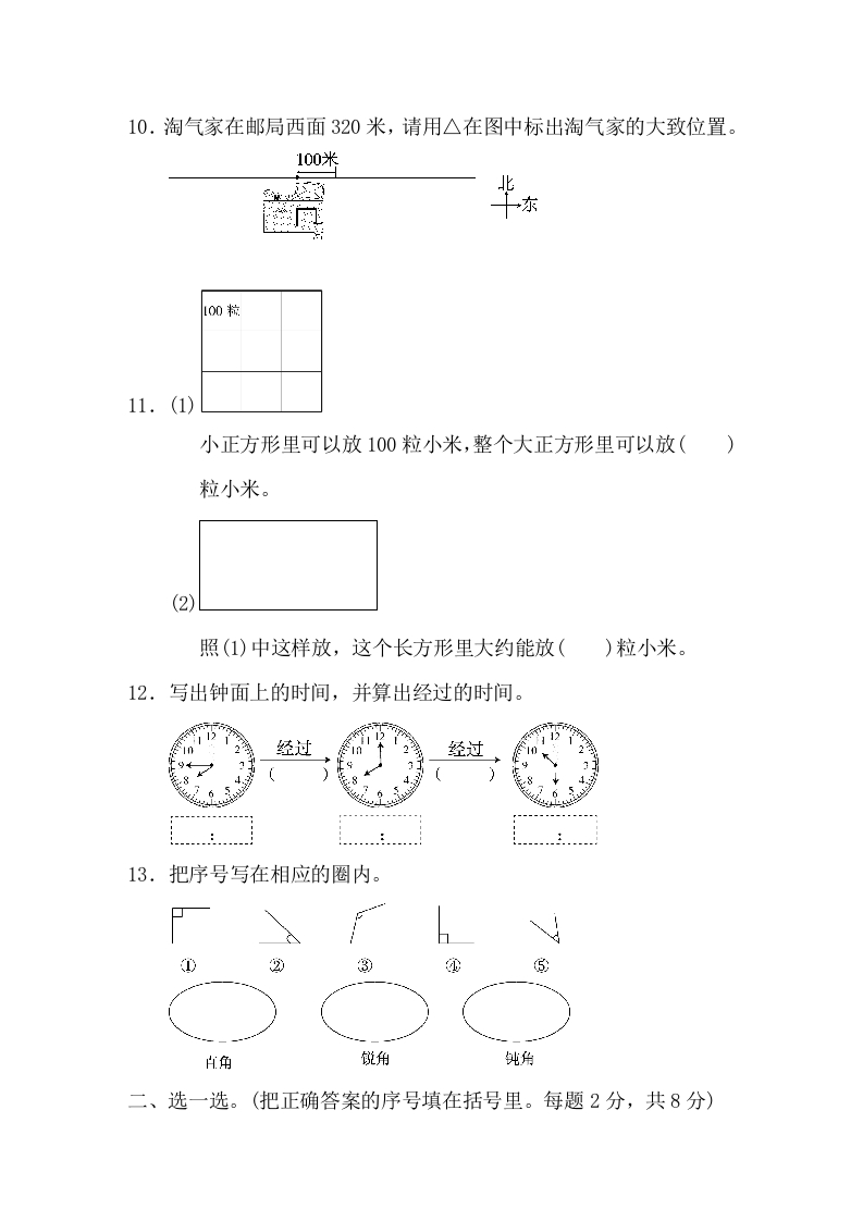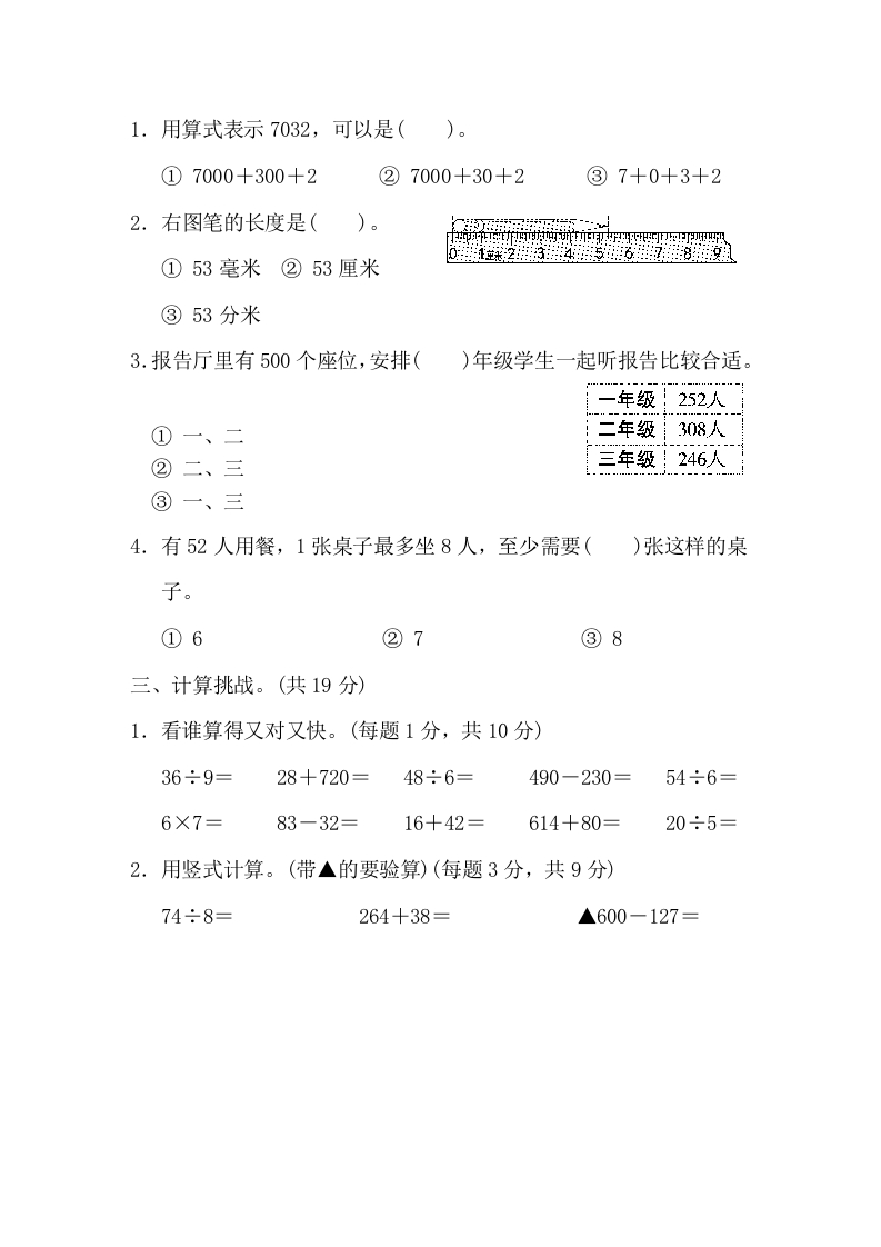 期末测试卷一、填一填,画一画。(第10题1分,第13题5分,其余每空1分,共38分)1.南京长江大桥铁路桥长六千七百七十二米,横线上的数写作)2.里最大能填几?53K53667>7583.在()里填上合适的单位。茶杯高约1()。1元硬币大约厚2()。飞机每时飞行约800()。刷牙大约需要3()。4.9763是()位数,其中数字“7”在()位上,表示)。5.找规律填数。7040,7045,(),7055,()。6.2千米=()米30毫米=()厘米90秒=()分()秒7.钟面上的时针、分针正好形成了一个直角,这时钟面上可能是()时。8.把2303,3203,3023,3230,2330这几个数按要求排列。()>()>()>()>(9.在算式()÷7=4…()中,余数最大可以填(),这时被除数是()。