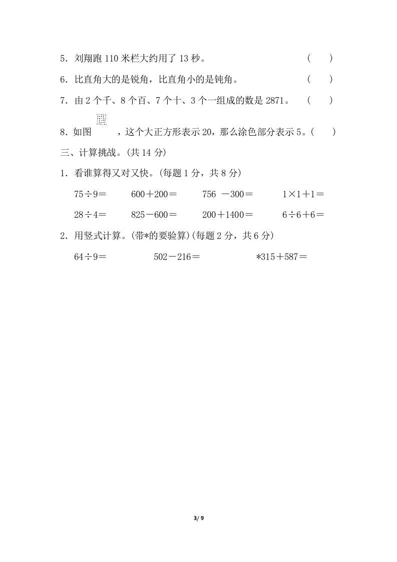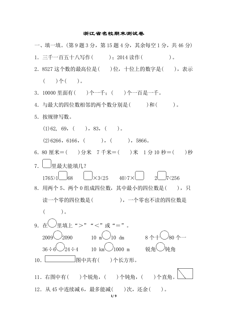 浙江省名校期末测试卷一、填一填。(第9题3分,第15题4分,其余每空1分,共46分)1.三千一百五十八写作():2014读作()2.8527这个数的最高位是()位,十位上的数字是(),表示()个()。3.10000里面有()个一千;()个一百是一千。4.与最大的四位数相邻的两个数分别是()和(5.按规律写数。(1)62,69,(),83,()。(2)6266,6166,(),(),5866。6.80厘米=()分米7千米=()米1分10秒=()秒7里最大能填几?1765>168X3<2540>7X7<2568.用两个5、两个0组成四位数,其中最小的四位数是(),只读一个零的四位数是(),一个零也不读的四位数是(9.在里填上“>”“<”或“=”2009209010 m10 dm8个+(80个36÷624÷410km1000m锐角钝角10.图中共有()个长方形。11.右图中有()个锐角,()个钝角,()个直角。12.从45中连续减6,最多能减()次,还余()。1/9