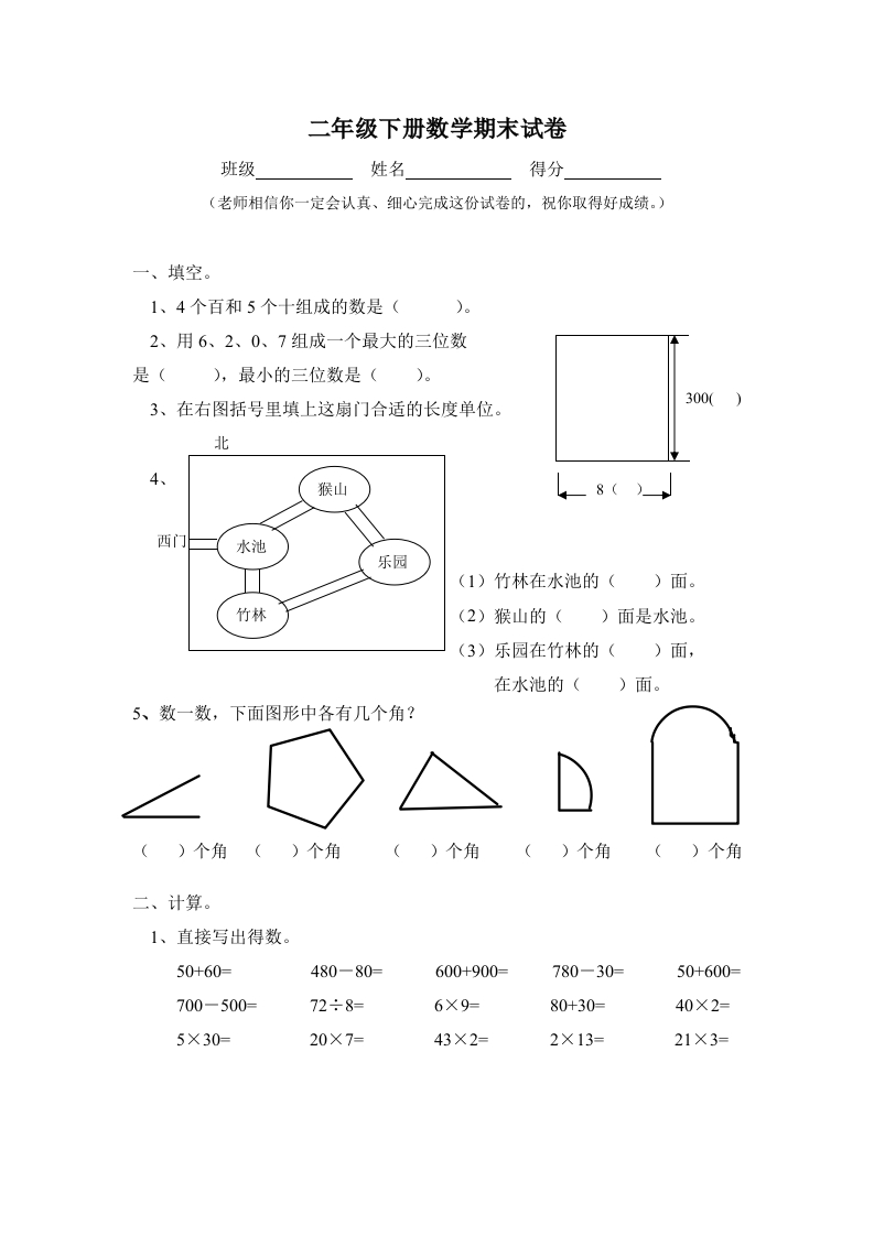 二年级下册数学期末试卷班级姓名得分(老师相信你一定会认真、细心完成这份试卷的,祝你取得好成绩。)一、填空。1、4个百和5个十组成的数是()。2、用6、2、0、7组成一个最大的三位数是(),最小的三位数是()。300()3、在右图括号里填上这扇门合适的长度单位。北猴山8()西门水池乐园(1)竹林在水池的()面。竹林(2)猴山的()面是水池。(3)乐园在竹林的()面,在水池的()面。5、数一数,下面图形中各有几个角?()个角()个角()个角()个角()个角二、计算。1、直接写出得数。50+60-480-80=600+900-780-30=50+600=700-50072÷8=6×9=80+30=40×2=5×30=20×7=43×2=2×13=21×3=