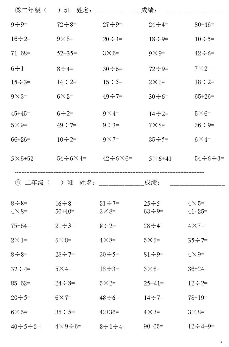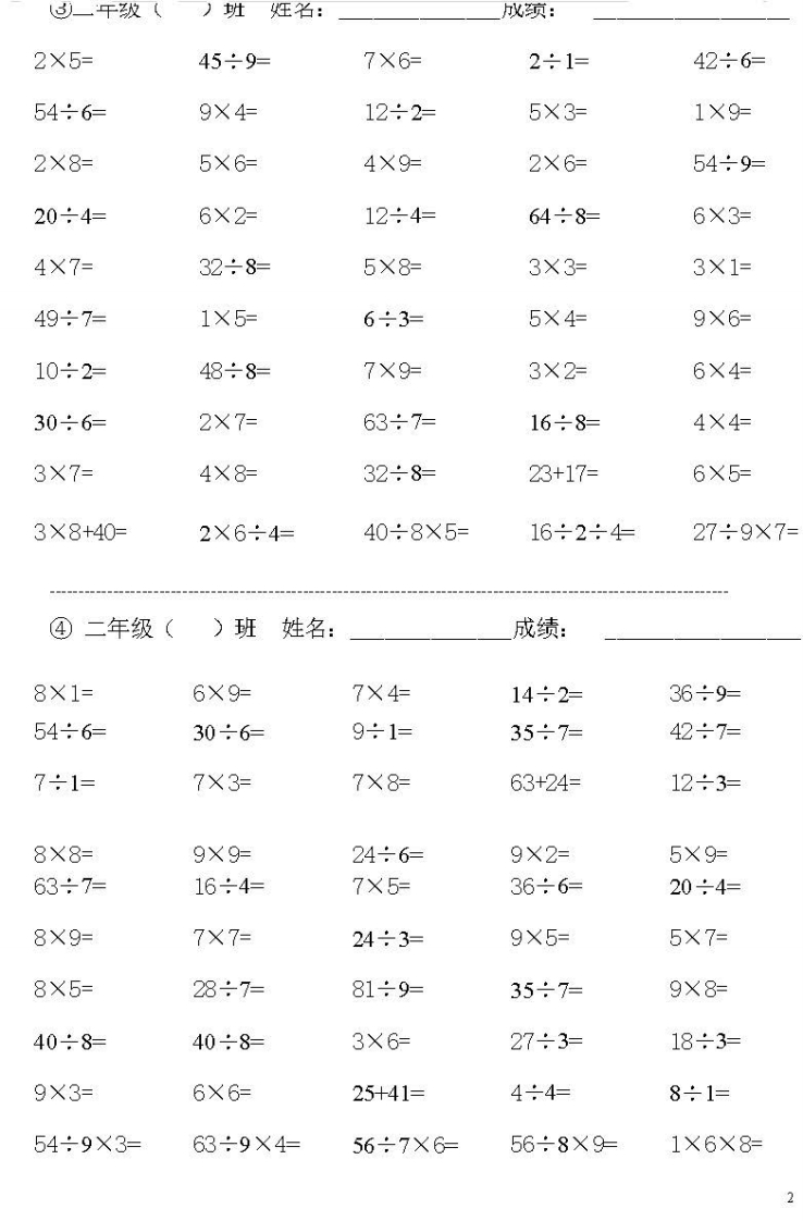 ①二年级()班姓名:成绩:45+5=4÷2=21÷3=36÷4=24÷6=1÷1=6×2=3×6=5÷5=56÷7=5×5=6÷2=9÷3=56+41=36÷6=72÷8=10÷5=90-45=56÷7=24÷3=9÷9=70-52=24÷4=16÷2=4×5=24÷8=49÷7=15÷5=42÷6=27÷3=14÷7=10÷2=27÷9=18÷2=8÷4=6÷1=54÷6=9×9=5×1=56÷8=15÷3=20÷4=72÷9=45-39=36÷9=3×6÷2=4×9÷6=3×4÷2=3×6÷3=3×6÷6=②二年级()班姓名:成绩:45÷5=54÷6=42÷7=4×3=72÷9=6÷6=7÷7=45÷9=16÷8=81÷9=12÷6=5÷1=30÷6=72÷8=9÷1=1×4=1×6=49÷7=2×7=18÷9=18÷6=56÷8=9×2=9÷9=1×1=1×8=21÷7=56÷7=27÷9=42÷6=24÷8=28÷7=64÷8=5X7=24÷8=36÷6=7X3=24÷6=18÷9=36÷4=48÷6=35÷7=63÷7=8×3=63÷7=4×6÷8=2×3÷6=8×5-8=81÷9÷3=19÷2×4=