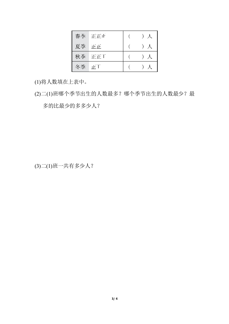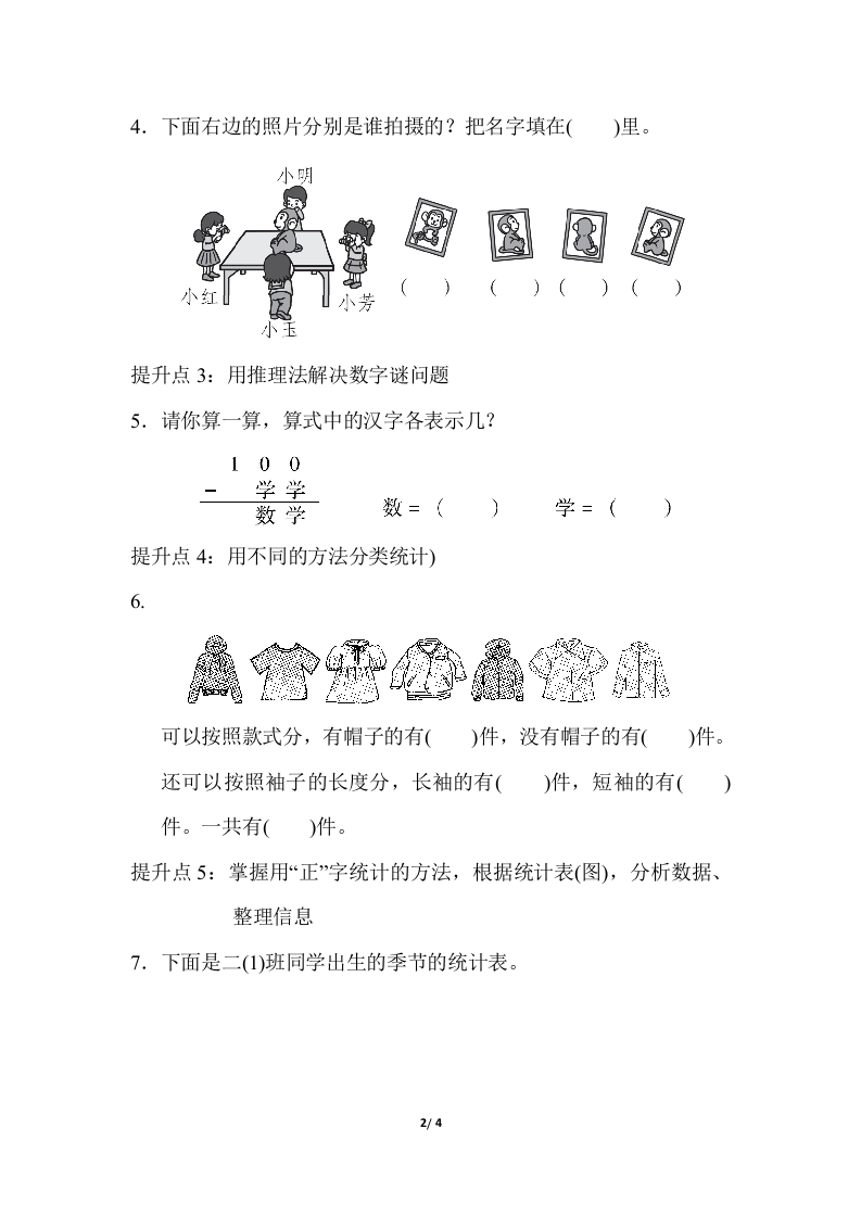 专项提升卷:周期问题、观察物体、算式推理、分类统计xmtt884个月前发布关注私信0.18MB4页02814 第1页 / 共4页 第2页 / 共4页 第3页 / 共4页 试读已结束,还剩1页,您可下载完整版后进行离线阅读 专项提升卷:周期问题、观察物体、算式推理、分类统计此内容为付费资源,请付费后查看¥1¥2会员服务免费立即购买您当前未登录!建议登陆后购买,可保存购买订单付费资源© 版权声明文章版权归作者所有,未经允许请勿转载。THE END二年级下数学 文本预览 专项提升卷5周期问题、观察物体、算式推理、分类统计提升点1:找出排列规律,解决周期问题1.有30颗糖,按淘气、笑笑、丁丁、冬冬的顺序,每人每次发一颗,想一想,谁分到最后一颗?2.同学们按照“一、二、三、一、二、三…”的顺序报数,请你算一算,第29个同学报的数是几?提升点2:根据图形特征,判断观察位置3.下面右边的图分别是从哪一面看到的?把序号填在()里。①茶片茶叶③()()1/4 查看更多 收起部分 喜欢就支持一下吧点赞14 分享QQ空间微博QQ好友海报分享复制链接收藏