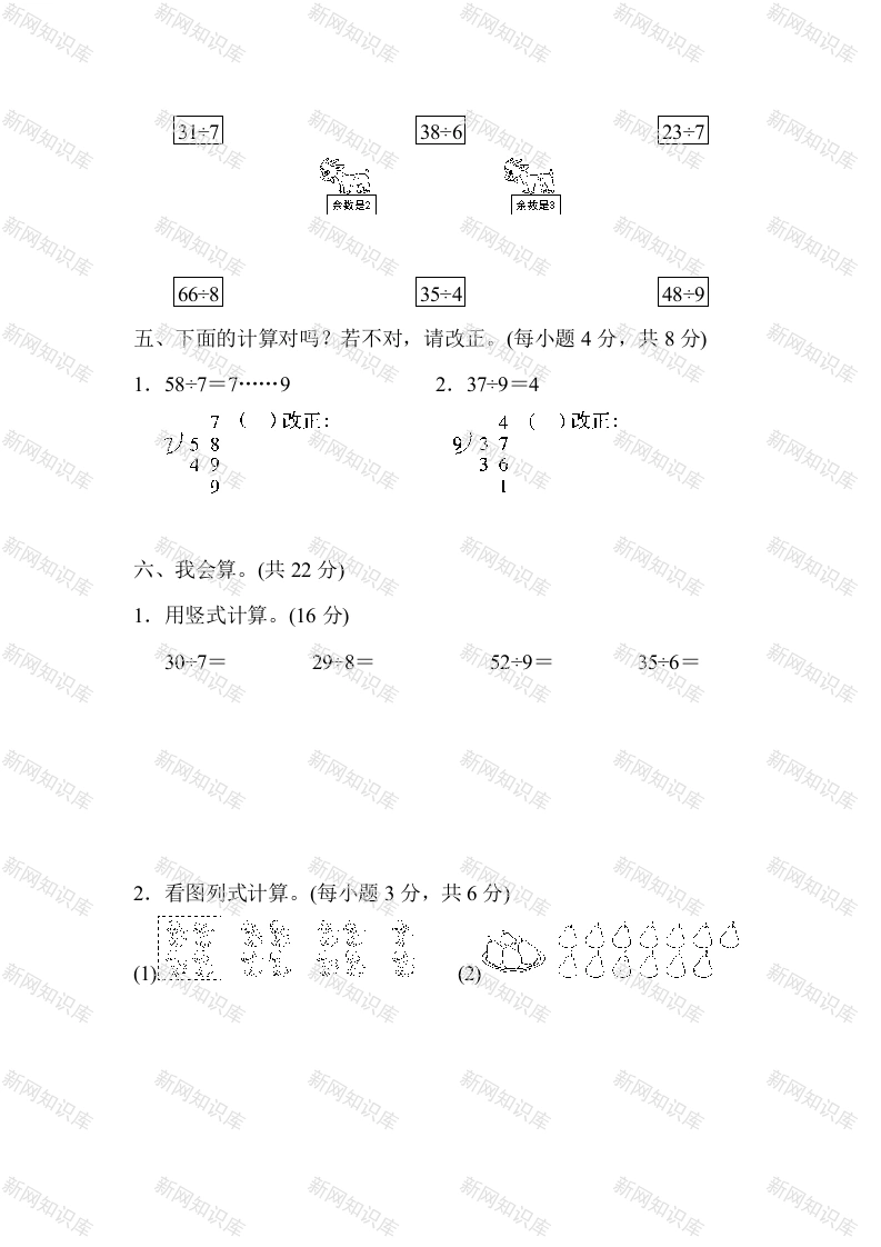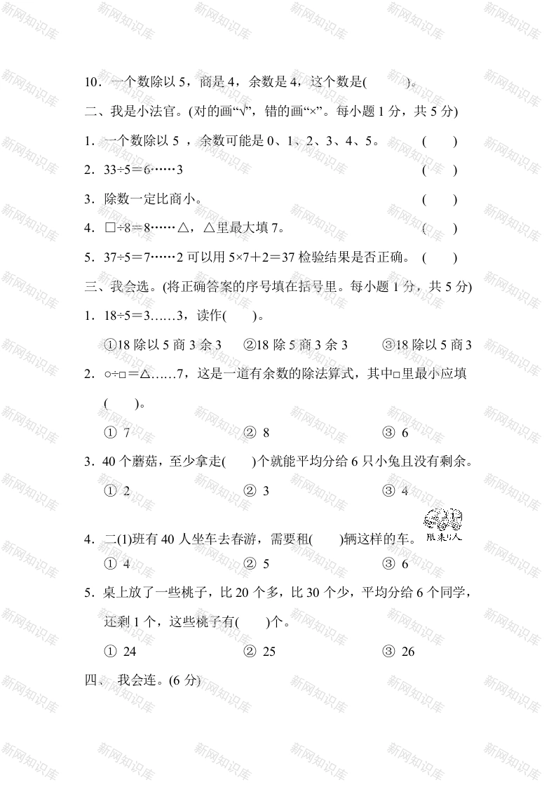 第一单元过关检测卷一、我会做。(每空1分,共28分)1.看图圈一圈,填一填。影着燕(1)13☐-☐组☐)(2)16--☐组☐个)2.43÷5=()…(),除数是(),余数是(),商是()3.计算有余数的除法时,余数一定要比除数()。4.☐7=6☐被除数最大是(5.3月份有31天,合()个星期余()天。6.有22个杯子,每6个装一盒,可以装满()盒。7.按下面的顺序排下去,第28个图形是(),第35个图形是(☒☑◇◇☒W◇◇8.()里最大能填几?)×7<326×()K39)×9k724×()2365>()×856>8×()9.在里填上合适的数。=3…1299…2
