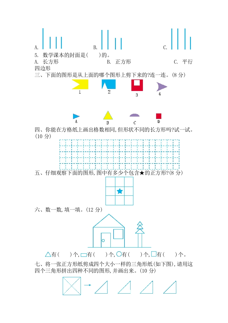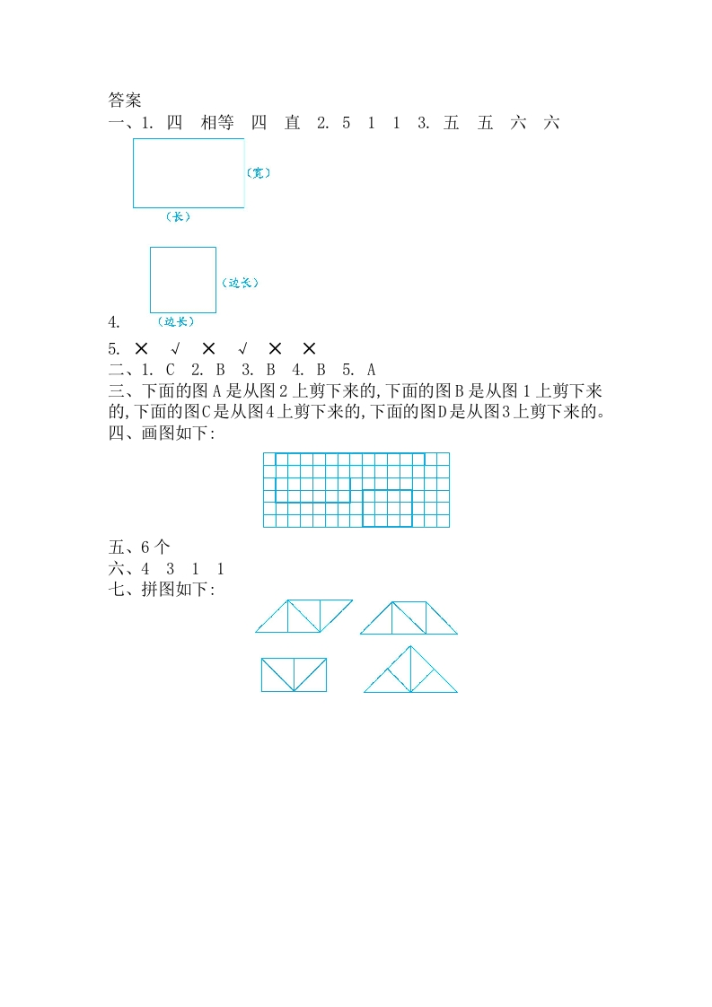 第七单元测试卷(2)时间:60分钟满分:100分分数一、填空。(42分)1.长方形有()条边,对边():正方形有()条边,每条边都相等,长方形和正方形的四个角都是()角。2.七巧板是由()个三角形、()个正方形和()个平行四边形组成的。3.五边形有()条边,()个角:六边形有()条边,()个角。4.写出下列图形各部分的名称。5.下列图形中是长方形或正方形的在括号里画“聊”,不是的画“×”。二、选择。(把正确答案的序号填在括号里)(10分)1.在图中,有()个长方形。A.3B.4C.52.下面的图形中,图形()是正方形。A.B.C.3.至少要用()根同样长的小棒才可以摆出一个正方形。A.2B.4C.64.用下面的()组小棒,正好可以围成一个长方形。