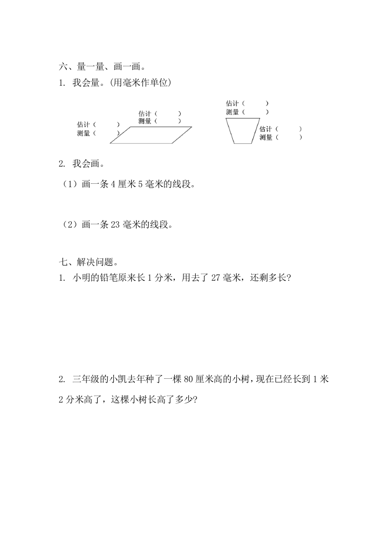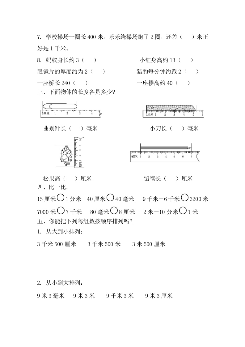第三单元检测卷及答案一、想一想,填一填。1.()、()、()、()和()都是长度的单位。2.尺子上一小格的长度是()毫米,毫米用()表示。3.1厘米=()毫米1分米=()厘米1千米=()米1米=()分米=()厘米4.9厘米=()毫米8分米=()厘米7千米=()米60厘米=()分米5000米=()千米30毫米=()厘米5.45毫米-25毫米=()毫米5厘米+20毫米=()毫米1米-6分米=()分米1千米-400米=()米65厘米+35厘米=()分米=()米87毫米一47毫米=()毫米=()厘米二、在()里填上合适的长度单位。1.一枚1分硬币、一张银行卡、一张电话卡的厚度大约都是1():粉笔盒的高度大约是8()。2.一把直尺长2分米,用这把直尺量一条1米长的绳子,至少要量()次。3.长江是我国的第一大河,也是世界第三大河,长约6400()。4.一粒大米大约长4()。5.墨水瓶高7厘米,也就是()毫米。6.10个小朋友手拉手排成一队的长度大约是10米,照这样计算,()个小朋友手拉手排成一队的长度大约是1千米。