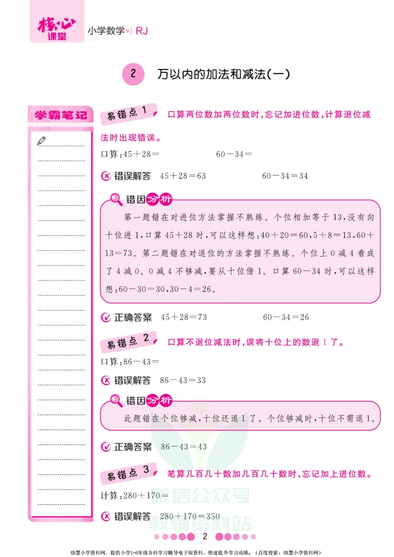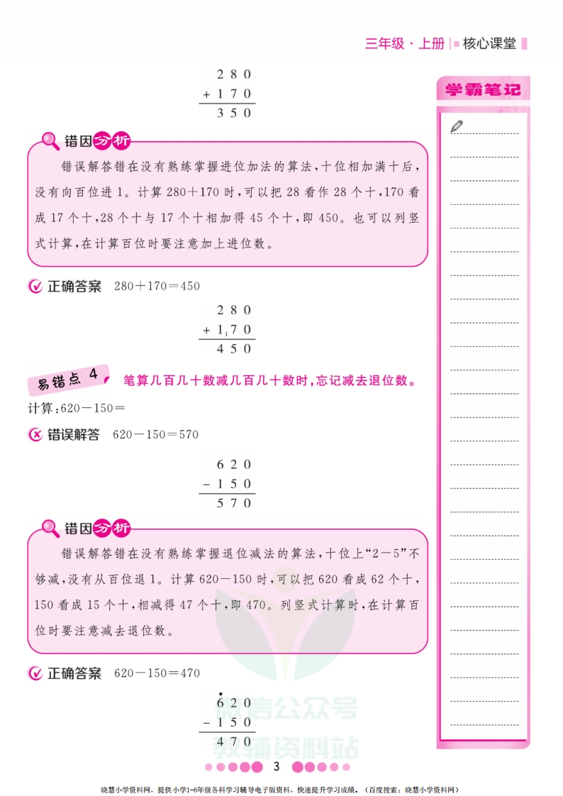 三年级·上册■核心课堂【时、分、秒易错点1,比较时间时,没有统一单位。学霸笔记在里填上“>”“<”或“=”。18秒3分&错误解答>Q错因今析错误解答错在直接进行数的比较了。当数相同时,直接比较单位,当单位相同时,直接比较数;当数和单位都不相同时,先把单位转化成统一的单位,再比较数的大小。心正确答案易错点2,当分是60时,忘记换算成整时。王明到阳光书店买书,他9:40进入书店,在书店里呆了20分钟。王明是什么时候离开书店的?飞错误解答9:60Q错因今析解答错在9:40过20分钟应是10:00,而写成了9:60。已知1时=60分,反过来,60分=1时。40分十20分=60分,60分=1时,9时十1时=10时,所以,王明是10:00离开书店的。心正确答案10:00●●●●●1●●●●●晓慧小学资料网,提供小学1-6年级各科学习辅导电子版资料,快速提升学习成绩。(百度搜索:晓慧小学资料网)