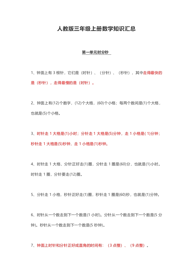 人教版三年级上册数学知识汇总第一单元时分秒1、钟面上有3根针,它们是(时针)、(分针)、(秒针),其中走得最快的是(秒针),走得最慢的是(时针)。2、钟面上有(12)个数字,(12)个大格,(60)个小格;每两个数间是(1)个大格,也就是(5)个小格。3、时针走1大格是(1)小时:分针走1大格是(5)分钟,走1小格是(1)分钟:秒针走1大格是(5)秒钟,走1小格是(1)秒钟。4、时针走1大格,分针正好走(1)圈,分针走1圈是(60)分,也就是(1)小时.时针走1圈,分针要走(12)圈。5、分针走1小格,秒针正好走(1)圈,秒针走1圈是(60)秒,也就是(1)分钟。6、时针从一个数走到下一个数是(1小时)。分针从一个数走到下一个数是(5分钟)。秒针从一个数走到下一个数是(5秒钟)。7、钟面上时针和分针正好成直角的时间有:(3点整)、(9点整)。