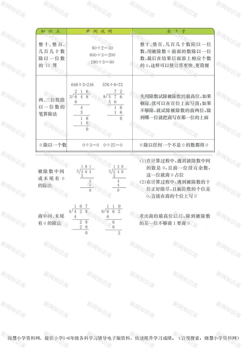 知识点举例说明金点子口算几十或几百乘几时,先用整十整十、整百50×6=300数乘一位整百数中0前面的数与一位数相乘,7×400=2800再看乘数末尾有几个0,就在积的末数的口算尾添上几个0求一个数小明家养了3只鸭子和12只母求一个数是另一个数的几倍,就是是另一个鸡,求母鸡的只数是鸭子的几倍,求这个数里面有几个另一个数,用数几倍的列式为12÷3=4这个数除以另一个数实际问题求一个数小兔有5只,小鸡的只数是小兔的几倍是求一个数的几倍是多少,就是求几的4倍,求小鸡有多少只,列式为多少的实个这样的数相加,用乘法计算5×4=20(只)际问题笔算时,从个位乘起,用一位数依次两、三位数374乘一位数X213乘三位数的个位,十位和百位上的1122数,乘到哪一位,积就写在那一位的的笔算下面。一位数与哪一位相乘的得数满几十就向前一位进几,前一位与一位数相乘后,得数应加上进位数0乘任何数都得0,乘数中哪一位是乘数中间4070,如果没有进位数,积中的0就写在有0的乘法X58与之相应的数位上,如果有进位数,3256这一位就是0加进位数230乘数末尾先把0前面的数与一位数相乘,再在×t5积的末尾添上未乘的0有0的乘法1150晓慧小学资料网,提供小学1-6年级各科学习辅导电子版资料,快速提升学习成绩。(百度搜索:晓慧小学资料网)