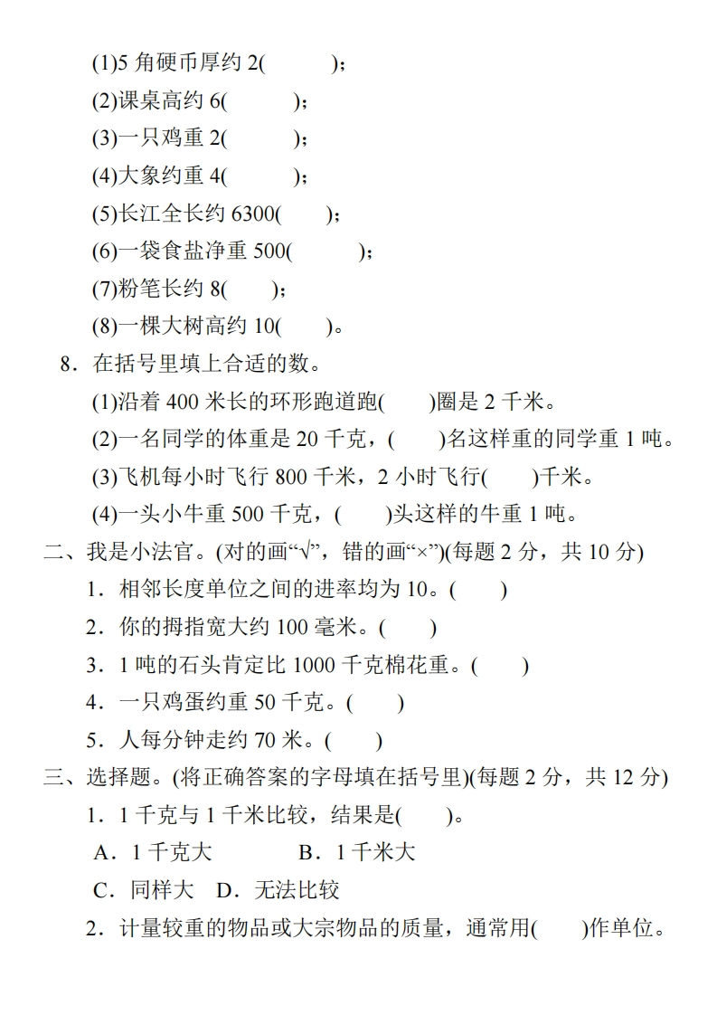人教三年级数学上册第三单元过关检测卷及答案一、我会填。(每空1分,共35分)1.0cm12345678910从刻度0到刻度3的长度是()厘米,也可以说是(毫米;从刻度1到刻度()的长度是60毫米。平70cm 1234562.0cm123456图中钥匙的长是()毫米;铅笔的长是()厘米(毫米。3.一名三年级学生的体重是35(),身高是130()4.我家距离学校大约有()米,步行大约需要()分钟。5.一辆载质量3()的卡车,运载每箱15()的苹果,这些苹果个儿挺大的,每个有200()重。6.1米=()分米=()厘米80毫米=()厘米9千米=()米6000克=()千克13吨一3000千克=()吨10000米=()千米2分米3厘米=()厘米18毫米=()厘米()毫米7.在括号里填上合适的单位。