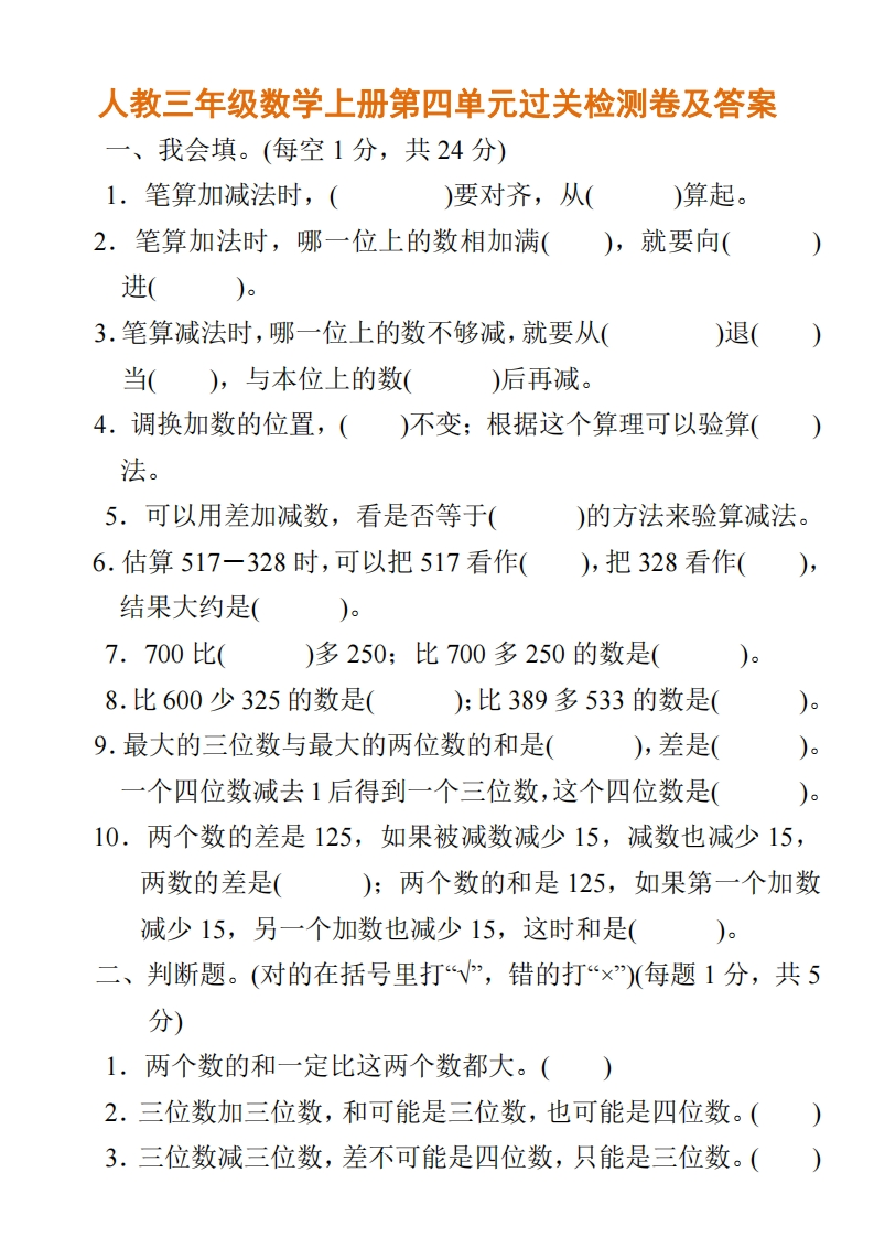 人教三年级数学上册第四单元过关检测卷及答案一、我会填。(每空1分,共24分)1.笔算加减法时,()要对齐,从()算起。2.笔算加法时,哪一位上的数相加满(),就要向(进(3.笔算减法时,哪一位上的数不够减,就要从()退(当(),与本位上的数()后再减。4.调换加数的位置,()不变;根据这个算理可以验算(法。5.可以用差加减数,看是否等于()的方法来验算减法。6.估算517一328时,可以把517看作(),把328看作(),结果大约是()。7.700比()多250:比700多250的数是()。8.比600少325的数是():比389多533的数是(9.最大的三位数与最大的两位数的和是(),差是()一个四位数减去1后得到一个三位数,这个四位数是()10.两个数的差是125,如果被减数减少15,减数也减少15,两数的差是();两个数的和是125,如果第一个加数减少15,另一个加数也减少15,这时和是()二、判断题。(对的在括号里打“V”,错的打“×)(每题1分,共5分)1.两个数的和一定比这两个数都大。()2.三位数加三位数,和可能是三位数,也可能是四位数。()3.三位数减三位数,差不可能是四位数,只能是三位数。()