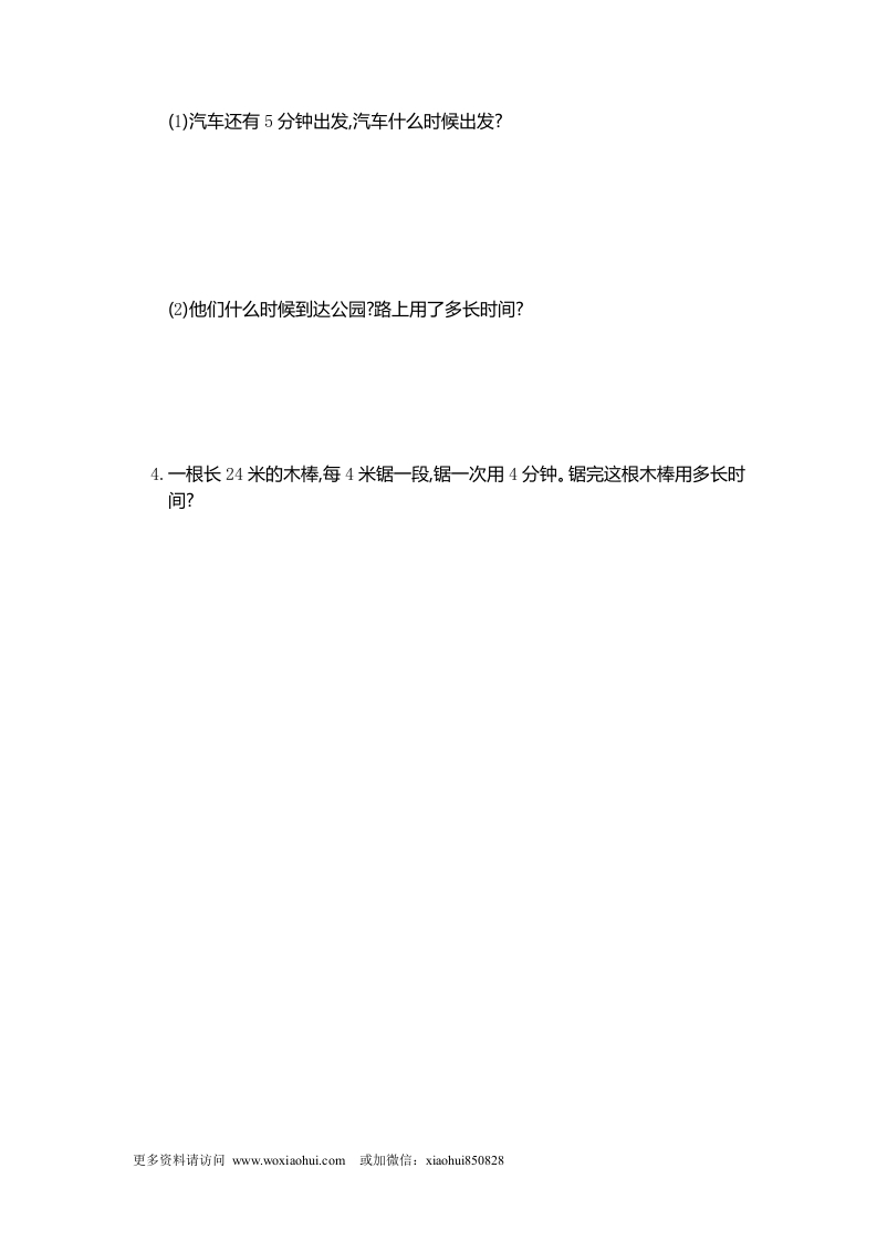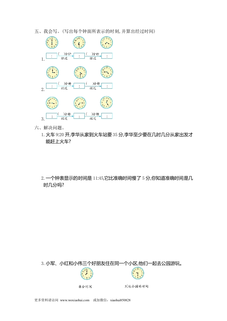第一单元测试卷(一)一、填一填。1.有些钟面上有3根针,它们分别是(入、()、(),其中()走得最快,它走一圈是()()走得最慢,它走一大格是()。2.我们学过的时间单位有()、()、()。计量很短的时间时,常用比分更小的单位()。3.秒针走一小格是()秒,走一圈是()秒,也就是()分。分针走一小格是()分,走一圈是(分,也就是()时。4.秒针从一个数走到下一个数经过的时间是()。5.在括号里填上合适的时间单位。(1)一节课时长40()。(②)爸爸每天工作8()。(3)李静跑50米的成绩是13((4)做一次深呼吸要4()。6.体育老师对第一小组同学进行50米跑测试,成绩如下:小红9秒,小丽11秒,小明8秒,小军10秒。()跑得最快()跑得最慢。二、辨一辨。(正确的画“√”,错误的画“×”)1.6分=600秒()2.分针走一大格,时针就走一小格。()3.秒针走一圈,分针走一小格。()4.小红每天早晨7:15从家出发,7:35到达学校,她在路上用了20分钟。()5.小军早上6:30起床,小强早上6:40起床小强比小军起得早。()三、单位换算。1时=()分5分=(秒4时()分3分()秒20分+50分=()分24秒+48秒-=()秒1时-40分=()分四、在○里填上“>”“<”或“=”6分○60秒160分○3时4分○200秒3时○300分250分○5时60秒○60分10分○600秒120分○2时更多资料请访问www.woxiaohui..com或加微信:xiaohuis850828