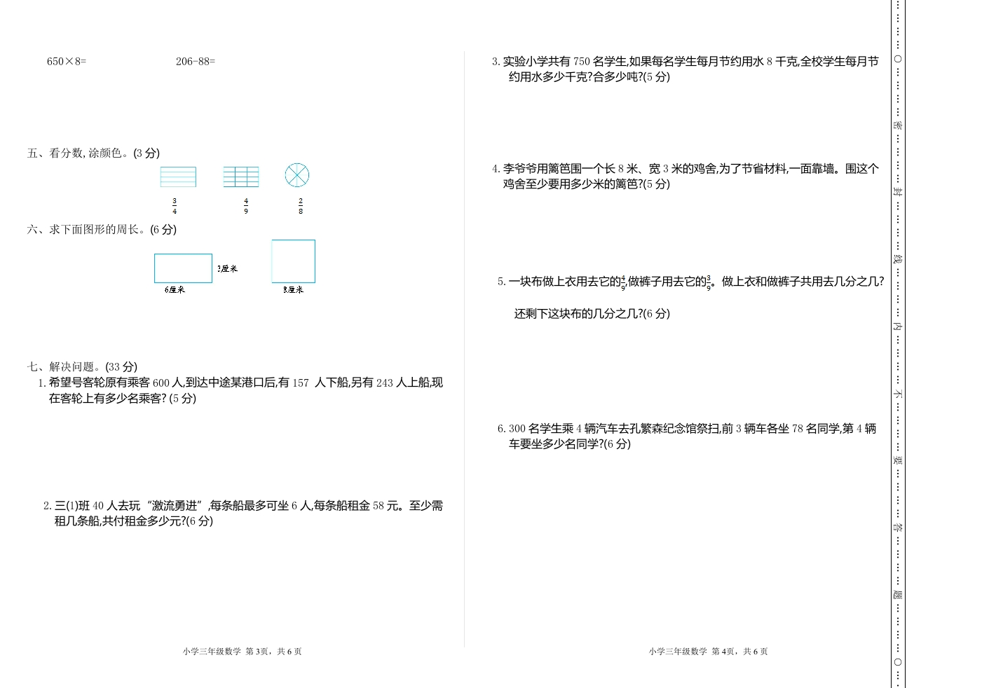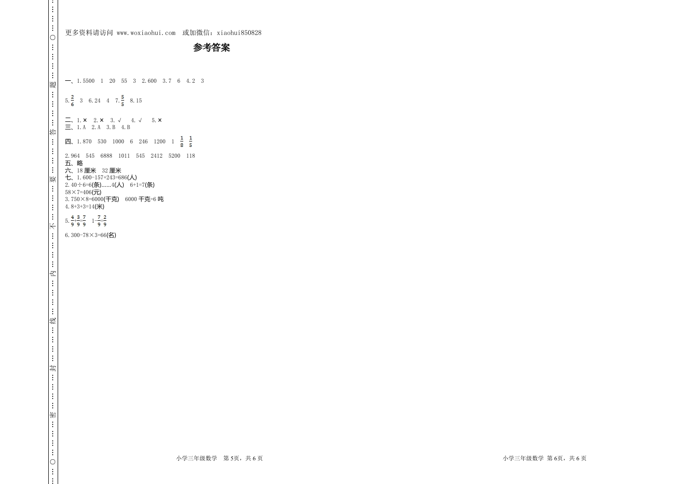::更多资料请访问www.woxiaohui.com或加微信:xiaohuis850828:三年级上学期期末检测卷(一)3.把一个长方形平均分成8份,每份是它的。()班级:姓名:满分:100分考试时间:90分钟4.2分和120秒时间相同。()5.两个长方形的周长相等,它们的长和宽一定也相等。()题序第一第二第三第四第五第六第七总分三、选一选。(在括号里填上正确答案的序号)(8分)1.操场跑道一圈是400米,跑了2圈后还差(米是1千米。A.200B.600C.800D.1000:题题题题题题2.红星幼儿园从下午3:30到下午4:20开展游戏活动,活动时间是()。得分A.50分钟B.10分钟C.30分钟D.1小时3.下图中,甲的周长()乙的周长。甲一一、填一填。(16分)A.大于B.等于C.小于D.以上都不对1.6吨-500千克=()千克4.将一张长方形纸连续对折2次其中的1份是这张纸的()。80分=()时(分5厘米+5毫米-()毫米A君BcD180秒=()分四、算一算。(29分)2.王老师每分钟跳绳198下,3分钟大约跳绳()下。1.直接写出得数。(9分)》3.小丽有14元,小明有2元,小丽的钱数是小明的()倍,小强的钱数是小明的3950-80=50+480200×5=倍小强有(元。48÷8=123×2200×6=4.要使341×口的积是三位数,口内最大可以填():要使积是四位数,口内最小可以填()。特181导:52.用竖式计算。(带※的要验算)(20分):※289+675※804-259=:984×7=782+229=上图涂色部分占整个圆的再涂(块,涂色部分就占:6.一个边长是6厘米的正方形,周长是()厘米如果一个长是8厘米的长方形周长与这个正方形的周长相等,那么长方形的宽是()厘米。7.计算1-时,把1化成的分数是(438+107=804×3=8.分针从5走到8,过了()分钟。二、辨一辨。(正确的画“”,错误的画“×”)(5分)1.长度单位之间的进率都是10。():2.250+0<250×0(小学三年级数学第1页,共6页小学三年级数学第2页,共6页