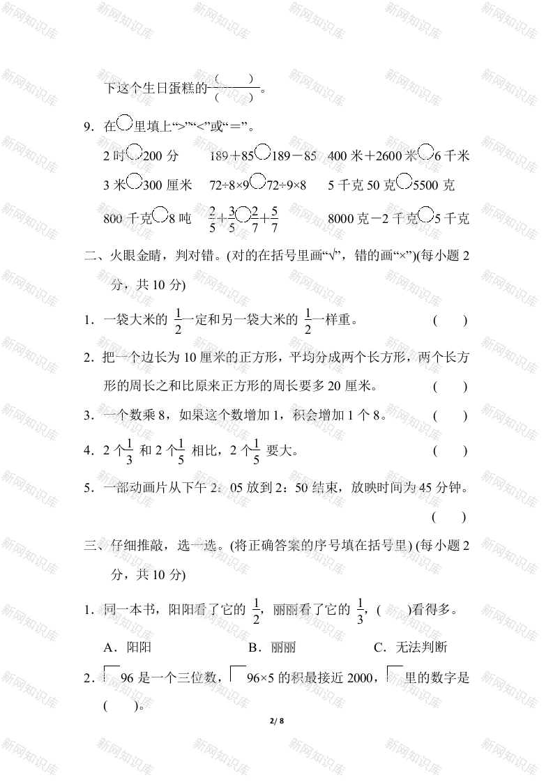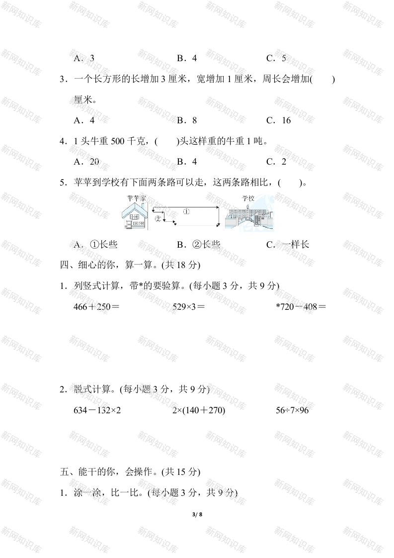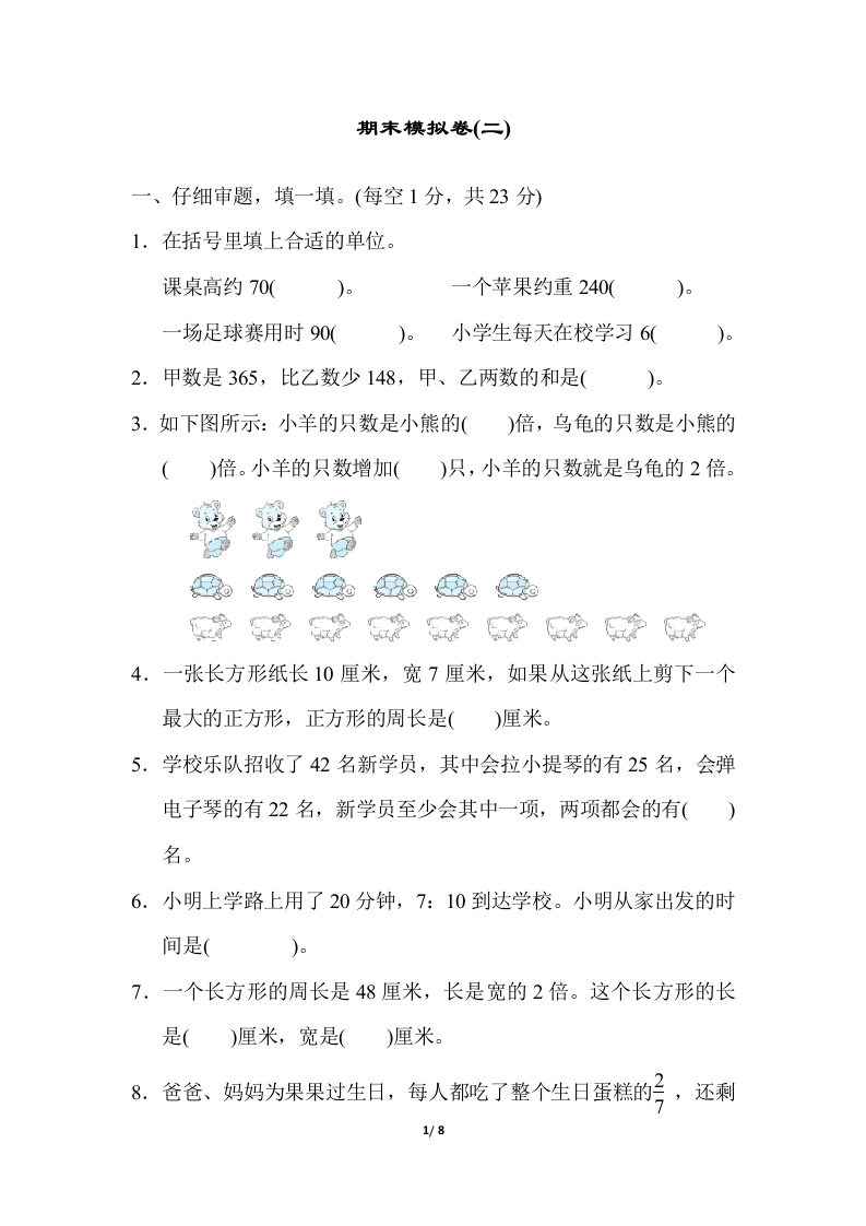 期末模拟卷(二)一、仔细审题,填一填。(每空1分,共23分)1.在括号里填上合适的单位。课桌高约70()。一个苹果约重2400)一场足球赛用时90(小学生每天在校学习6()o2.甲数是365,比乙数少148,甲、乙两数的和是()3.如下图所示:小羊的只数是小熊的()倍,乌龟的只数是小熊的()倍。小羊的只数增加()只,小羊的只数就是乌龟的2倍。4.一张长方形纸长10厘米,宽7厘米,如果从这张纸上剪下一个最大的正方形,正方形的周长是()厘米。5.学校乐队招收了42名新学员,其中会拉小提琴的有25名,会弹电子琴的有22名,新学员至少会其中一项,两项都会的有()名。6.小明上学路上用了20分钟,7:10到达学校。小明从家出发的时间是()7.一个长方形的周长是48厘米,长是宽的2倍。这个长方形的长是()厘米,宽是()厘米。8。爸爸、妈妈为果果过生日,每人都吃了整个生日蛋糕的号,还剩1/8