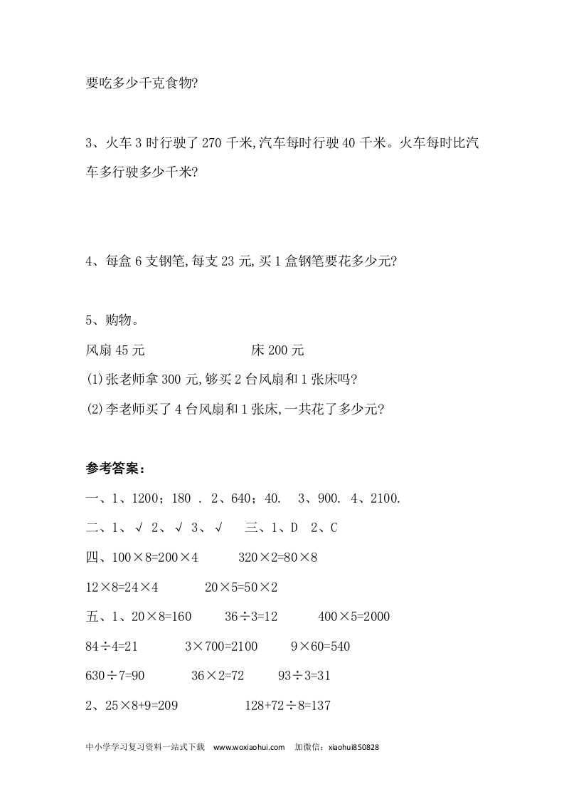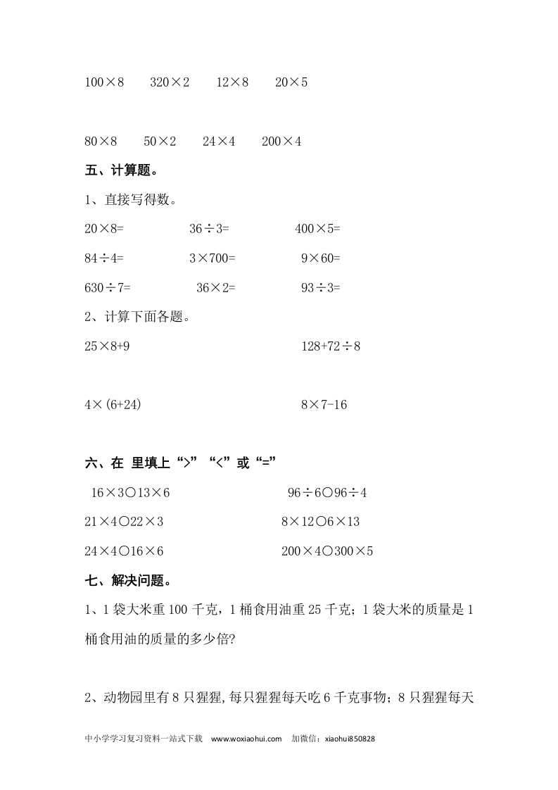 北师大版三年级上期中测试卷及答案一、填空题。1、300和4相乘得(),6乘30得()。2、160的4倍是(),160是4的()倍。3、最小的三位数与最大的一位数相乘,积是()。4、小明每天跳绳300下,他一星期能跳()下。二、判断题。(对的画“√”,错的画“×”)1、3个相同的数相加的和,等于这个数的3倍。()2、计算400×9时,可以先计算4×9=36,再在得数后面添写两个0()3、一位数乘三位数,积可能是三位数,也可能是四位数。()三、选择题。(把正确答案的序号填在括号里)1、6乘200的积是()。A、60B、600C、120D、12002、一个三位数乘2,积()。A、一定是三位数B、一定是四位数C、可能是三位数,也可能是四位数D、无法确定四、把积相同的算式用线连起来。中小学学习复习资料一站式下载www.woxiaohui..com加微信:xiaohui850828