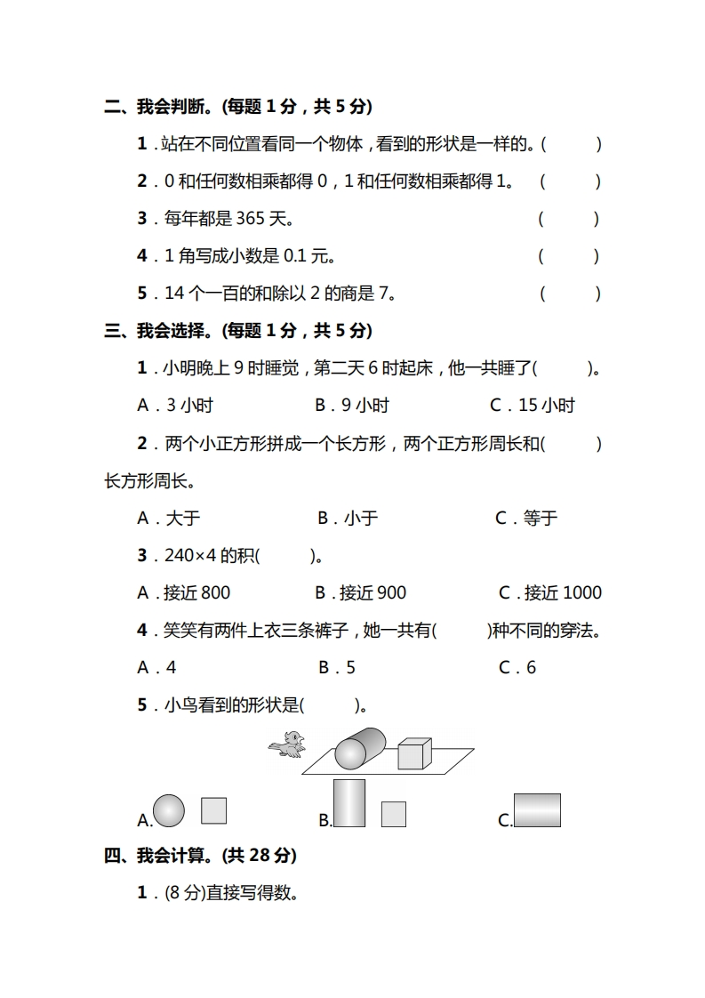 小学三年级上册北师大版本数学期末真题检测F卷含答案此内容为付费资源,请付费后查看
