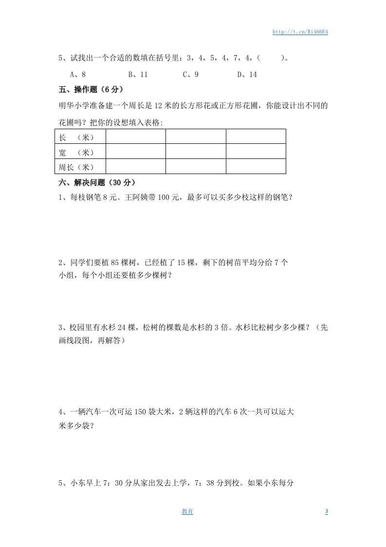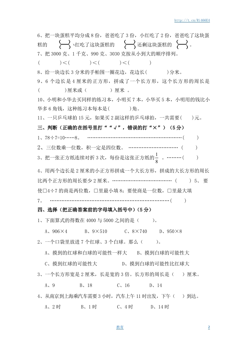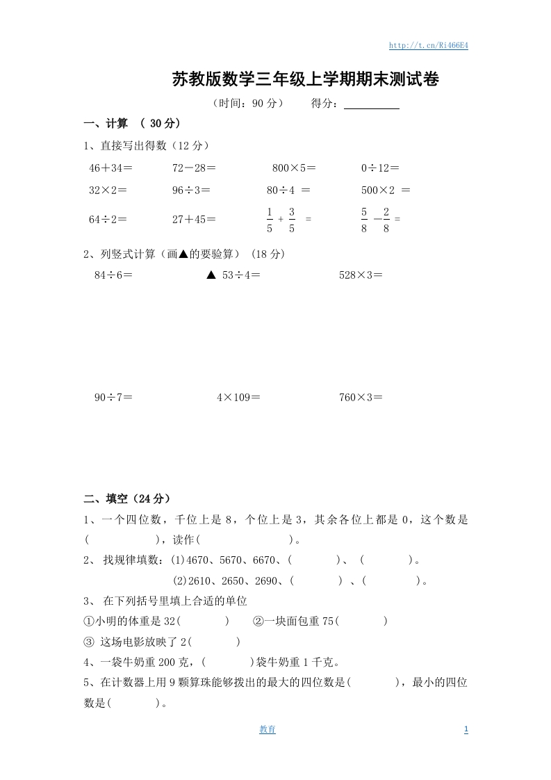 http://t.cn/Ri466E4苏教版数学三年级上学期期末测试卷(时间:90分)得分:一、计算(30分)1、直接写出得数(12分)46+34=72-28=800×5=0÷12=32×2=96÷3=80÷4=500×2=64÷2=27+45=1+35_255882、列竖式计算(画▲的要验算)(18分)》84÷6=▲53÷4=528×3=90÷7=4×109=760×3=二、填空(24分)1、一个四位数,千位上是8,个位上是3,其余各位上都是0,这个数是(),读作()。2、找规律填数:(1)4670、5670、6670、()、()。(2)2610、2650、2690、()、()。3、在下列括号里填上合适的单位①小明的体重是32(②一块面包重75()③这场电影放映了2(4、一袋牛奶重200克,()袋牛奶重1千克。5、在计数器上用9颗算珠能够拨出的最大的四位数是(),最小的四位数是()。数直