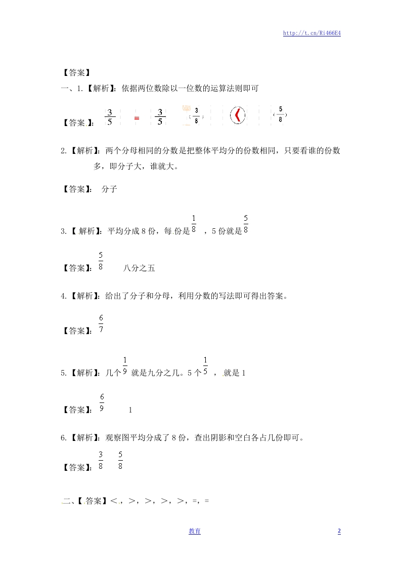 http://t.cn/Ri466E4苏教版三上同步课课练7.1几分之一(1)一、填空。1、用分数表示涂色的部分并比较大小2、两个分母相同的分数比较大小,只要看谁表示的份数多即()大,谁就大。()3、把一块大蛋糕平均分成8份,这样的5份是.它的(),读作()。4、分母是7,分子是6的分数是()。115、6个9是(),5个5是()。6、下图中阴影部分用分数可以表示为(),空白部分用分数可以表示为()。四、在O里填上“>”、“<”或“=”。081023o310199481078o片o1o19010o26891012六、我会涂(给下面各图涂上颜色表示下面的分数)。322-5数直1