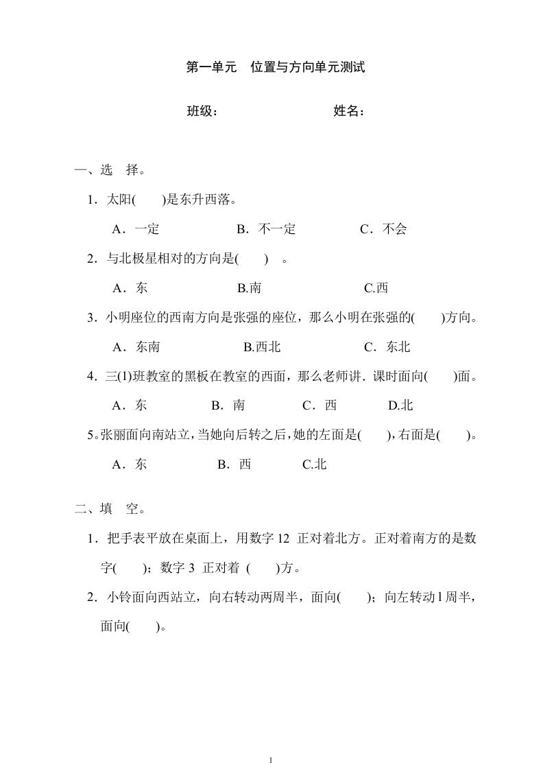 第一单元位置与方向单元测试班级:姓名:一、选择。1.太阳()是东升西落。A.一定B.不一定C.不会2.与北极星相对的方向是()。A.东B.南C.西3.小明座位的西南方向是张强的座位,那么小明在张强的()方向。A.东南B.西北C.东北4.三(1)班教室的黑板在教室的西面,那么老师讲.课时面向()面。A.东B.南C.西D.北5。张丽面向南站立,当她向后转之后,她的左面是(),右面是()。A.东B.西C.北二、填空。1,把手表平放在桌面上,用数字12正对着北方。正对着南方的是数字):数字3正对着()方。2.小铃面向西站立,向右转动两周半,面向():向左转动1周半,面向()。