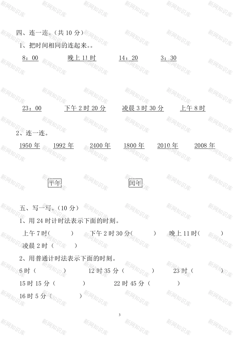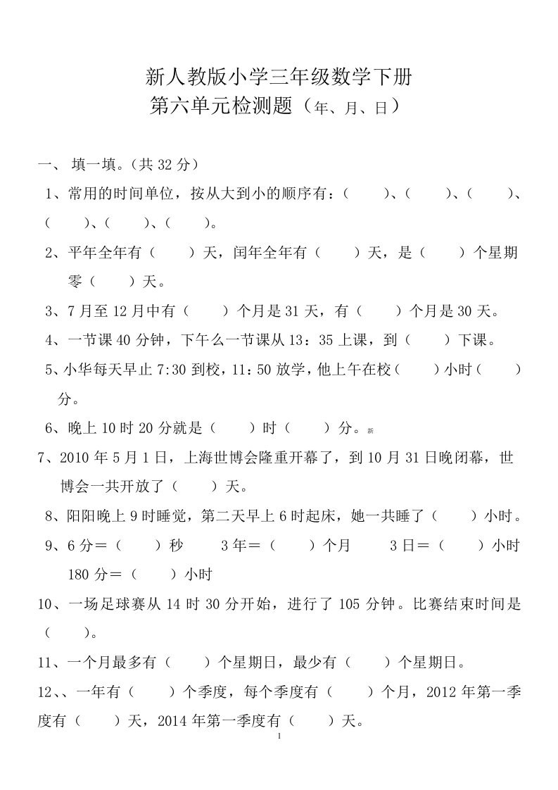 新人教版小学三年级数学下册第六单元检测题(年、月、日)一、填一填。(共32分)1、常用的时间单位,按从大到小的顺序有:()、()、()、()、()、()。2、平年全年有()天,闰年全年有()天,是()个星期零()天。3、7月至12月中有()个月是31天,有()个月是30天。4、一节课40分钟,下午么一节课从13:35上课,到()下课。5、小华每天早止7:30到校,11:50放学,他上午在校()小时(分。6、晚上10时20分就是()时()分。新7、2010年5月1日,上海世博会隆重开幕了,到10月31日晚闭幕,世博会一共开放了()天。8、阳阳晚上9时睡觉,第二天早上6时起床,她一共睡了()小时。9、6分=()秒3年=()个月3日=()小时180分=()小时10、一场足球赛从14时30分开始,进行了105分钟。比赛结束时间是()。11、一个月最多有()个星期日,最少有()个星期日。12、、一年有()个季度,每个季度有()个月,2012年第一季度有()天,2014年第一季度有()天。