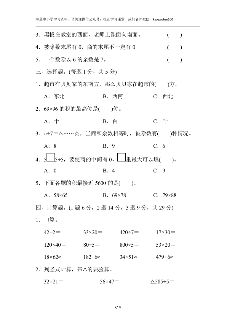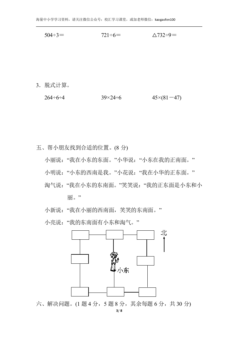 海量中小学学习资料,请关注微信公众号:校汇学习课堂,或加老师微信:ka0 gaofen100三年级第二学期数学期中测试卷一、填空题。(每空1分,共23分)36×4246:630x44062.某搜救队向东南方向进行搜救,途中接到指令要求原路返回,搜救队应当向()方向行进。3.傍晚,当我们面向太阳时,后面的方向是(),左边的方向是(),右边的方向是(4.要使☐645的商是两位数,中最大能填(),要使664的商是两位数,☐中最小能填()5.一个三位数除以9,商可能是()位数,也可能是()位数。6.妈妈买了3件大衣花了868元,平均每件大约花()元。7.27个18的和是(),344是8的()倍。8.在)里填上心<”或=”。27÷3945×21950427÷7人32x29.张华家三口人,平均每人每月要吃15千克粮食,那么他们一家三口人一年要吃()千克粮食。二、判断题。(每题1分,共5分)1.605÷5的商的中间有0。2.485÷7的商的最高位要写在百位上。1/8