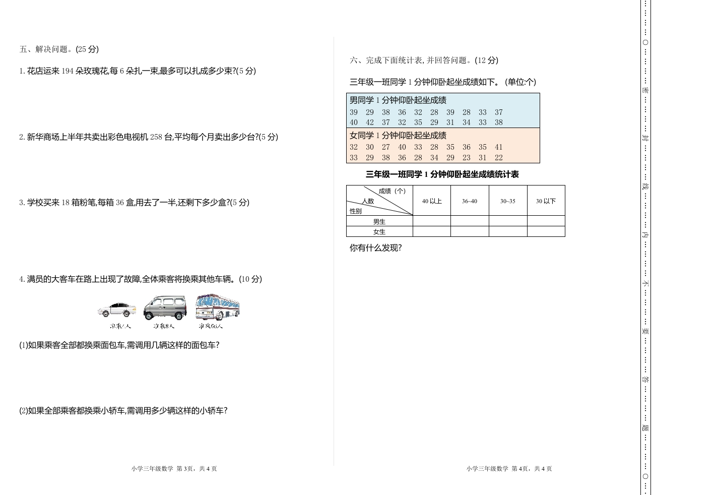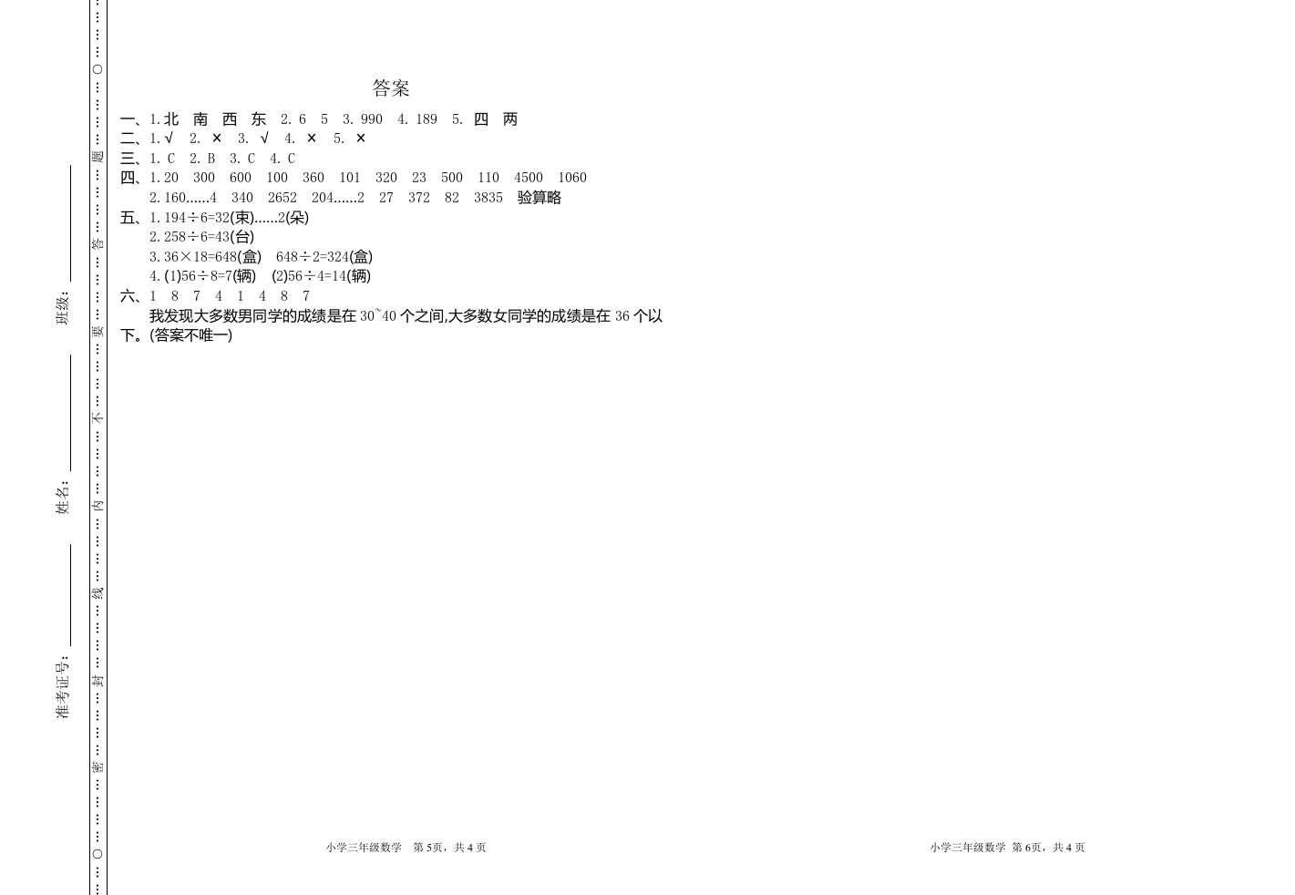 :::2020-2021学年下学期重点小学三年级期中测试卷A.三位数B.四位数C.三位数或四位数班级:姓名:满分:100分考试时间:90分钟2.346÷6的商的最高位是(:题序第一题第二题第三题第四题第五题第六题总分A.百位B.十位C.个位··:3.三位数除以一位数,商(:得分A.一定是两位数:一、填空题。(20分)B.一定是三位数1.地图通常是按上()下()、左(、右()绘制的。C.可能是三位数也可能是两位数:224÷6如果商是三位数,里最小是():如果商是两位数,里最大是(4.三位数除以一位数被除数中间有0,商的中间():3.用最小的两位数乘最大的两位数积是(。A.一定有0B.一定没有0C.可能有0,也可能没有04.一个数除以5的商是37余数是4这个数是(四、计算题。(30分)战5.19×23的积大约是()百多:37×49的积接近()千。1.直接写得数。(12分)120÷630×103000÷5300÷3=二、判断题。(正确的画“”,错误的画“×”)(5分):12×30=505÷5=960÷3=69÷3=2000÷4=550÷5=90×50=53×20=1.457÷3的商是三位数。()…2.列竖式计算,带☆的要验算。(18分)2.0除以任何数都得0。()804÷52040÷678×34614÷33.一个数除以8有余数那么余数最大是7。()4.一个三位数除以一位数商一定是两位数。():5.40×50的积的末尾有两个0。()108÷431×12☆328÷4☆65×59三、选择题。(把正确答案的序号填在括号里)(8分)1.两位数乘两位数所得的积可能是()。:小学三年级数学第1页,共4页小学三年级数学第2页,共4页: