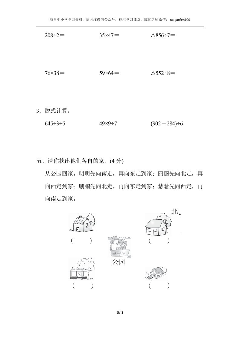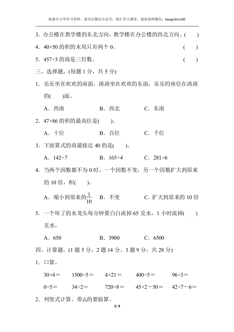 海量中小学学习资料,请关注微信公众号:校汇学习课堂,或加老师微信:ka0 gaofen100三年级第二学期数学名校期中测试卷一、填空题。(每空1分,共22分)1.小文去上学,她先向北走到商场,再向东北走到学校,她放学后按照原路返回,应该先向()走到(),再向()走到家。2.483是7的()倍,36的18倍是()3.估算12×69时,可以把12看作(),69看作(),积约是()。4.一个数除以6,商是18,有余数,当余数最大时这个数是(5.验算有余数的除法时,可以用()×()十()=()的方法来验算。6.58×45的积的末尾有()个0。7.要使4×39的积是四位数,里最小填(8246,如果商是三位数,那么里最小填():如果商是两位数,那么☐里最大填(9.在里填上“>w<或“=”。280÷7人140÷2150×4160×356×1034×203000÷6贰2000÷410.某超市卖出5箱色拉油,每箱6瓶,每箱色拉油的价格是1350元,每瓶色拉油()元。二、判断题。(每题1分,共5分)1.如果被除数的中间有0,那么商的中间也一定有0。2.两位数乘两位数,积一定是四位数。1/8