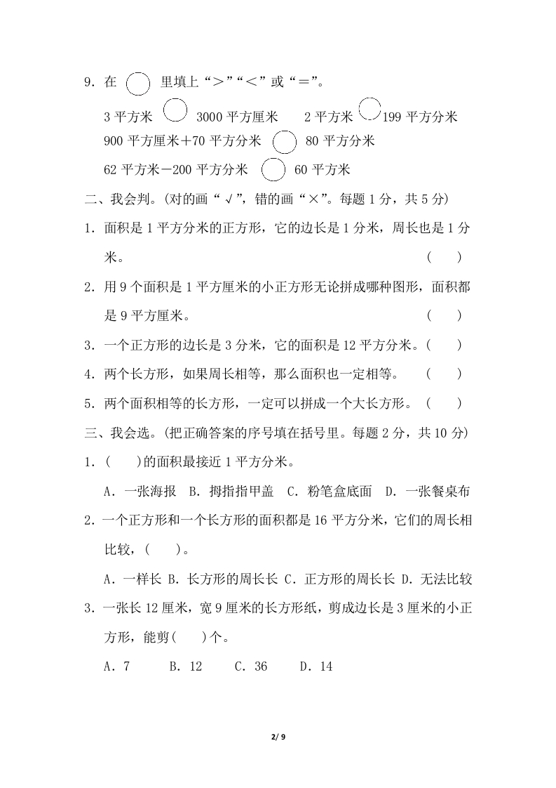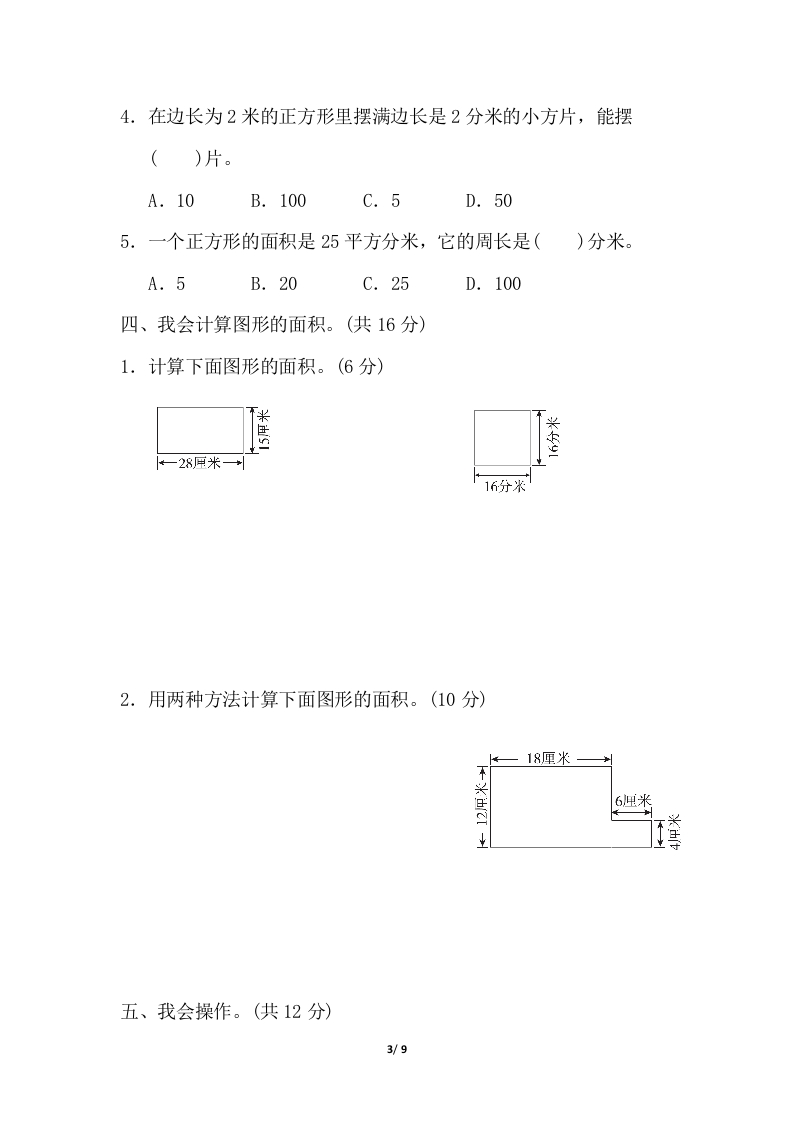 第七单元过关检测卷一、我会填。(每空1分,共19分)1.在括号里填上合适的单位名称。(1)运动场上的直跑道长120((2)李丰家的住房面积为150()。(3)一台液晶电视屏幕面积约为100((4)课桌高8().2.4个相同的小正方形刚好拼成一个面积为36平方分米的大正方形,每个小正方形的面积是()平方分米。3.贝贝先用一根铁丝围成了一个边长为16厘米的正方形,后来她又改围成一个长方形,长是18厘米,宽是()厘米,正方形的面积比长方形的面积大()平方厘米。4.一个周长是28厘米的正方形,面积是(5.一张7寸照片的长大约是18厘米,宽大约是13厘米,它的面积大约是()。6.长方形的宽是6分米,比长短4分米,它的面积是()。7.用两根同样长的铁丝,分别围一个长方形和一个正方形,(的面积比较大。8.2平方分米=()平方厘米10平方米=()平方分米700平方厘米=()平方分米100分米=()米1/g