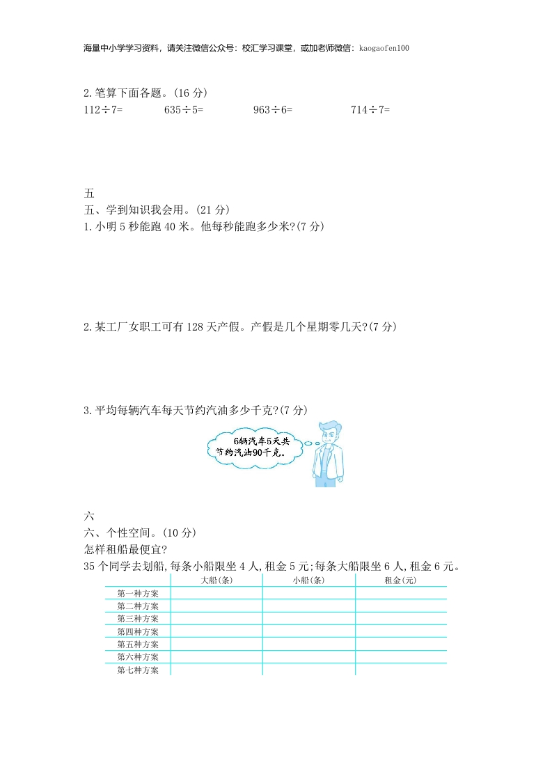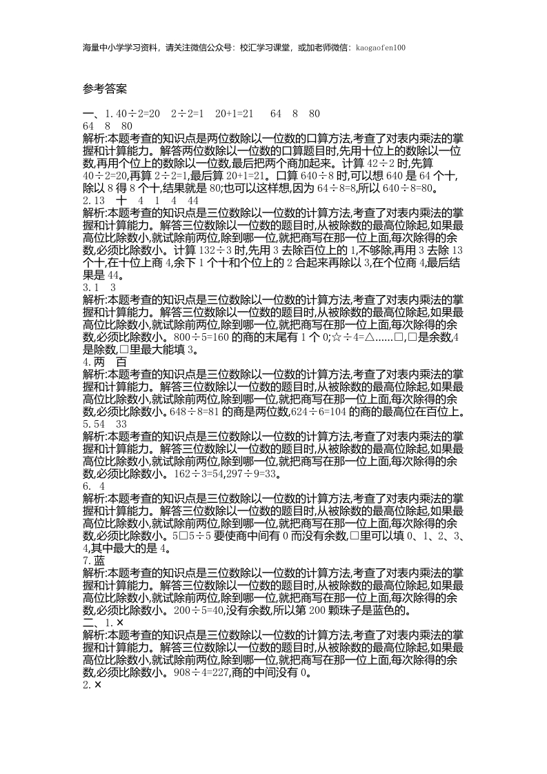 海量中小学学习资料,请关注微信公众号:校汇学习课堂,或加老师微信:kaogaofen100三年级数学下册第一单元测试卷(2)时间:90分钟满分:100分分数:一、填一填。(23分)1.口算42÷2时,先算(),再算(),最后算()。口算640÷8时,可以想640是()个十,除以8得()个十,结果就是():也可以这样想,因为()÷8=(),所以640÷8=()。2.在用竖式计算132÷3时,先用3去除百位上的1,不够除,再用3去除()个十,在()位上商(),余下()个十和个位上的2合起来再除以3,在个位上商(),最后结果是()。3.800÷5的商的末尾有()个0:☆÷4=△…☐,☐里最大能填()。4.648÷8的商是()位数,624÷6的商的最高位在()位上。5.3的()倍是162,297是9的()倍。6.5☐5÷5要使商中间有0而没有余数,口里最大填()。7.按下面的方法穿珠子。从左往右数,第200颗珠子是()色的。0000000000-0-二、明辨是非。(对的在括号里画“√”,错的画“×”)(10分)1.908÷4的商的中间有1个0。2.0乘任何数都得0,0除以任何数都得0。3.三位数除以一位数,商一定是三位数。4.被除数末尾有0,商的末尾一定也有0。5.808÷2=44()三、我会选。(将正确答案的序号填在括号里)(10分)》1.三位数除以一位数,商是()。A.三位数B.两位数C.三位数或两位数2.827÷口的商是两位数,☐里可以填()。A.7B.8C.93.728连续减7,最多可以减()次最后等于0。A.140B.104C.144.840÷3÷2的结果()840÷(3×2)。A.大于B.等于C.小于5.34个小朋友去北海公园划船,每条船最多坐4人,最少要租()条船。A.8B.9C.10四、计算。(26分)1.口算。(10分)60÷248÷4=700÷7=606÷6=360÷3=69÷3=480÷2=440÷4=268÷2=0÷9=