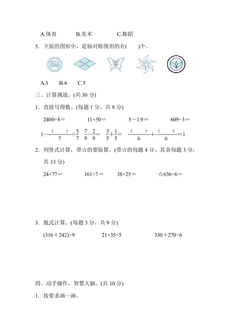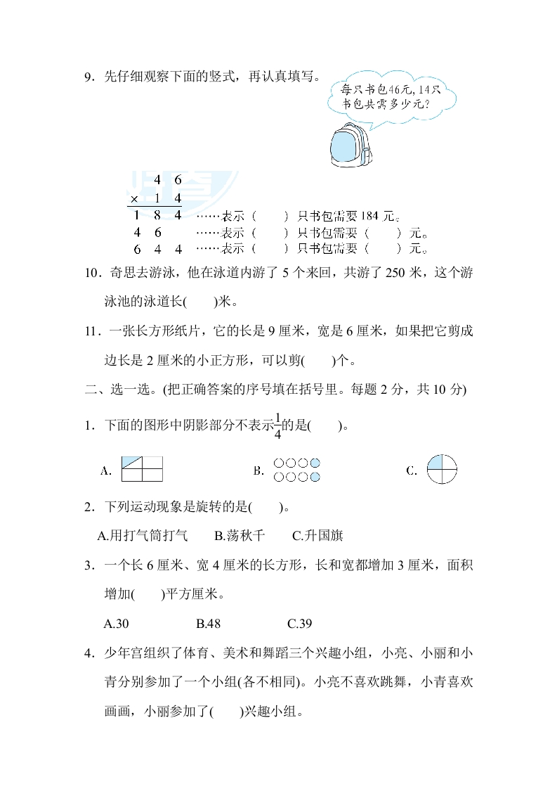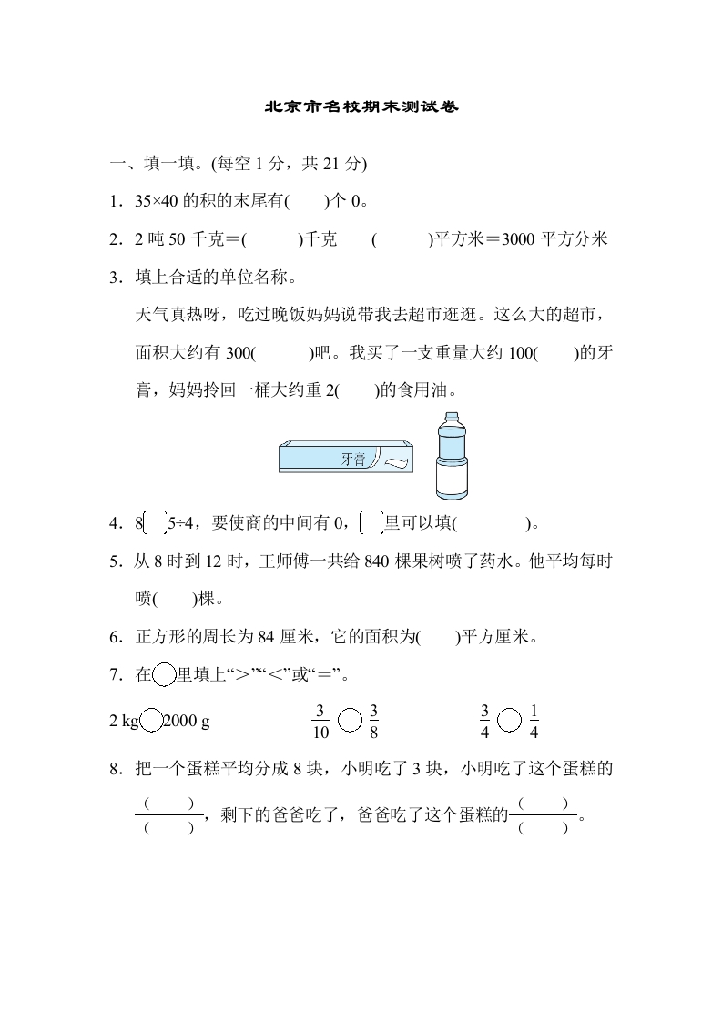 北京市名校期末测试卷一、填一填。(每空1分,共21分)1.35×40的积的末尾有()个0。2.2吨50千克=()千克()平方米=3000平方分米3.填上合适的单位名称。天气真热呀,吃过晚饭妈妈说带我去超市逛逛。这么大的超市,面积大约有300()吧。我买了一支重量大约100()的牙膏,妈妈拎回一桶大约重2()的食用油。牙音》4.85÷4,要使商的中间有0,〔里可以填(5.从8时到12时,王师傅一共给840棵果树喷了药水。他平均每时喷()棵。6.正方形的周长为84厘米,它的面积为)平方厘米。7.在(○里填上“>“<”或“=”。2kg(2000g品08.把一个蛋糕平均分成8块,小明吃了3块,小明吃了这个蛋糕的《,剩下的爸爸吃了,爸爸吃了这个蛋糕的