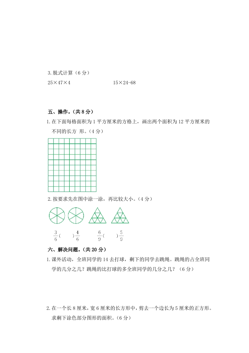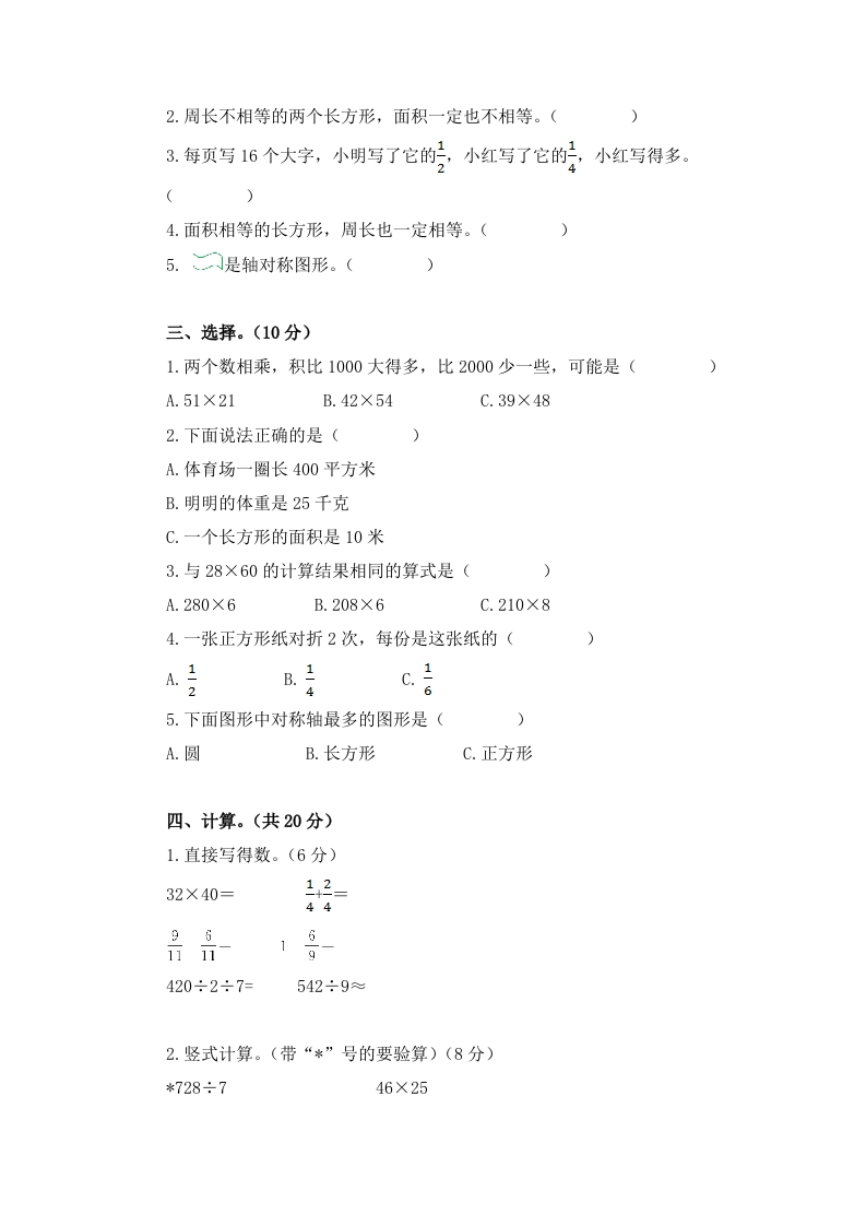 期末测试卷1一、填空。(32分)1.周长为12米的正方形,面积是()平方米。2.380×5的积的末尾有()个0。3里面有()个是1,7个是()。4.庆祝“六·一”儿童节买彩纸,每简12元,买16筒,一共多少钱?用12×16,可以这样算()×()=(),(×()=(),()+()=(元。5.教室长8(),宽5(),面积约40(),前面的讲台高约80(。6.在一个长6厘米,宽4厘米的长方形里截取一个最大的正方形,这个正方形的面积是(),剩下图形的形状是()。7.用合适的单位填空。一间教室的面积是40(学校的跑道长0.4(一张试卷的大小是800(一个菜园占地3(8.最大的两位数与最小的两位数的积是(),与它最接近的四位数是()。9.电梯的上下运动是()现象,拧水龙头是()现象。10.在○里填上“<”“>”或“=”。4500克)4千克3000克)3下克○月○g二、判断。(10分)1.钟面上分针走动属于旋转现象。(