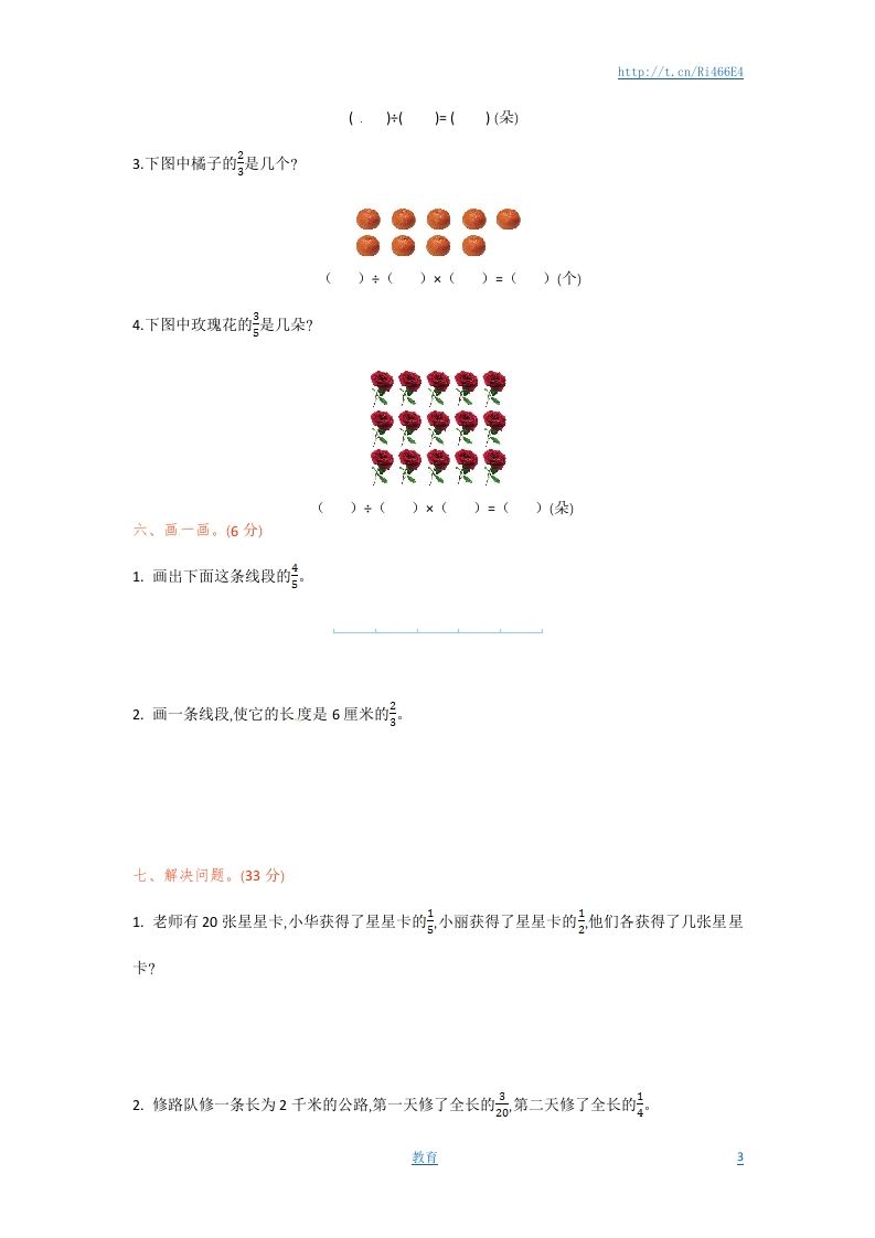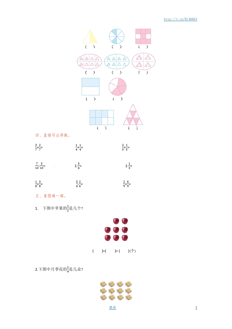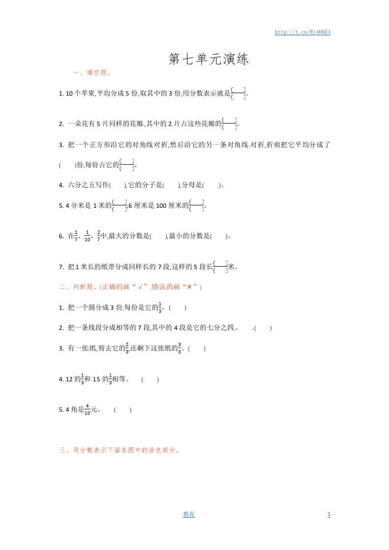 http://t.cn/Ri466E4第七单元演练一、填空题。1.10个苹果,平均分成5份,取其中的3份,用分数表示就是子2.一朵花有5片同样的花瓣,其中的2片占这些花瓣的子3.把一个正方形沿它的对角线对折,然后沿它的另一条对角线对折,折痕把它平均分成了(份,每份占它的子4.六分之五写作(),它的分子是(分母是()。5.4分米是1米的6厘米是100厘米的月6.在号品钟,最大的分数是(最小的分数是()7.把1米长的纸带分成同样长的7段,这样的5段长一米。二、判断题。(正确的画“√”,错误的画“×”)1.把一个圆分成3份,每份是它的。()2.把一条线段分成相等的7段,其中的4段是它的七分之四。()3.有一张纸剪去它的还剩下这张纸的。()4.12的和15的相等。()5.4角是无。()三、用分数表示下面各图中的涂色部分。数直