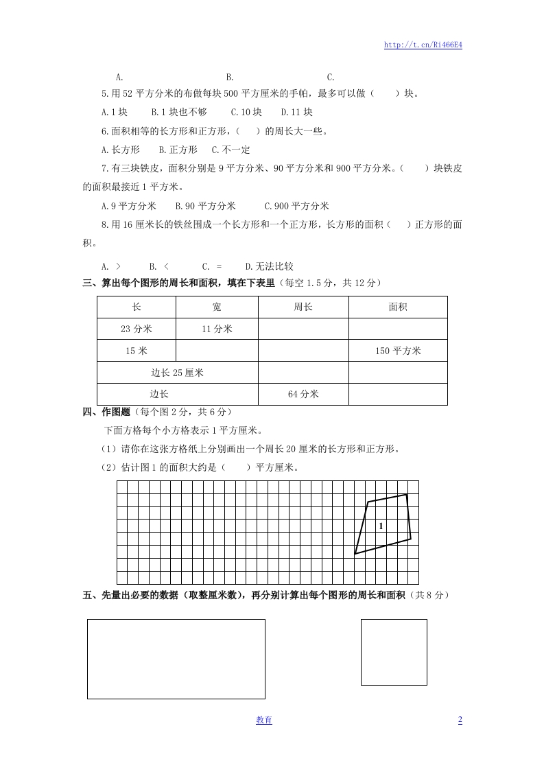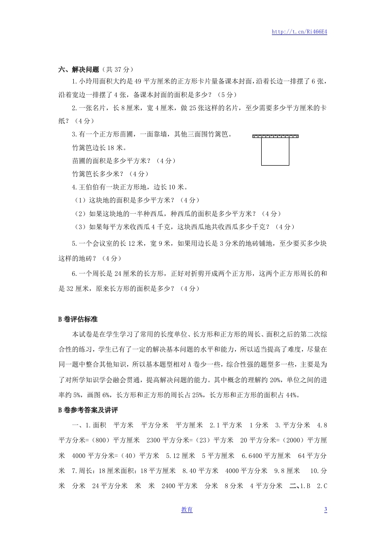http://t.cn/Ri466E4第六单元评估检测题(B卷)(时间:60分钟总分:100分)一、填空(每空1分,共29分)1.计算或测量面积时要用()单位,常用的面积单位有()、()2.边长1米的正方形面积是().1平方分米的正方形,边长是(3.课桌面约50()4.8平方分米=()平方厘米2300平方分米=()平方米20平方分米=()平方厘米4000平方分米=()平方米5.用边长1厘米的小正方形拼成图形它的周长是()厘米,面积是()平方厘米。6.一张边长80厘米的方桌,面积是()平方厘米,合()平方分米。7.用两个边长3厘米的正方形,拼成一个长方形,这个长方形的周长是()厘米,面积是()平方厘米。8.一个长方形菜地长是8米,宽是5米,面积是()平方米,合(平方分米。9.用3个边长都是1厘米的小正方形拼成长方形,这个长方形的周长是()厘米10.在括号里填上合适的单位名称。(1)一块校牌的长6(),宽4(),面积是((2)学校操场的长是60()宽40(),面积是((3)一块正方形手帕的边长是2(),周长是(),面积是(二、选择正确答案的序号填在()里(每题1分,共8分)1.下面()单位不是用来度量面积大小的。A.平方厘米B.千米C.平方米D.dm22.课桌面约50()。A.平方米B.平方厘米C.平方分米D.米3.下图中,长方形被分成甲、乙两部分,这两部分()。A.周长和面积都相等甲B.周长和面积都不等C.周长相等,面积不等4.用1平方厘米的小正方形,拼成如下的图形,周长最长的是(),面积最大的是()。教直