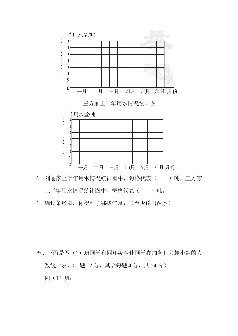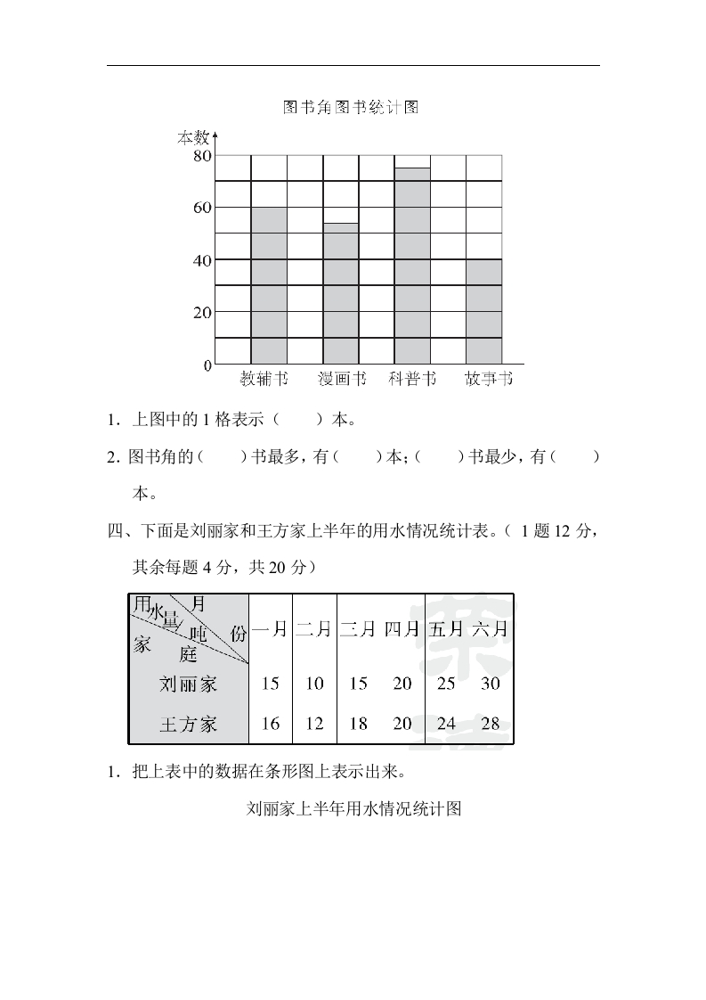 教材过关卷(7)一、我会填空。(每空4分,共20分)1.条形统计图有竖式和()式两种。2.在条形统计图中,如果每格表示20万人,则60万人要画()格,2格表示()人,半格表示()人。3.一只平底锅能同时煎两个蛋,用它煎1个蛋需要2分钟(正、反面各1分钟),煎5个蛋至少需要()分钟。二、我会判断。(对的画“V,错的画“×”)(每题3分,共15分)1.在同一幅竖式条形统计图中,直条越长,数量就越大。()2.一只小鸡捉一条虫子大约用5分钟,三只小鸡捉3条虫子,大约需要15分钟。3.数据的整理可以用画“正字的方法。4.在同一幅条形统计图中,每1格表示的数值要相等。5.妈妈做早餐的过程及时间如下:洗锅1分钟、淘米2分钟、熬粥15分钟、煎鸡蛋3分钟、拌小菜4分钟,妈妈做这顿早餐至少需要18分钟。三、我会根据统计图回答问题。(每空3分,共15分)下面是小胖整理班级图书角的图书时画出的统计图。