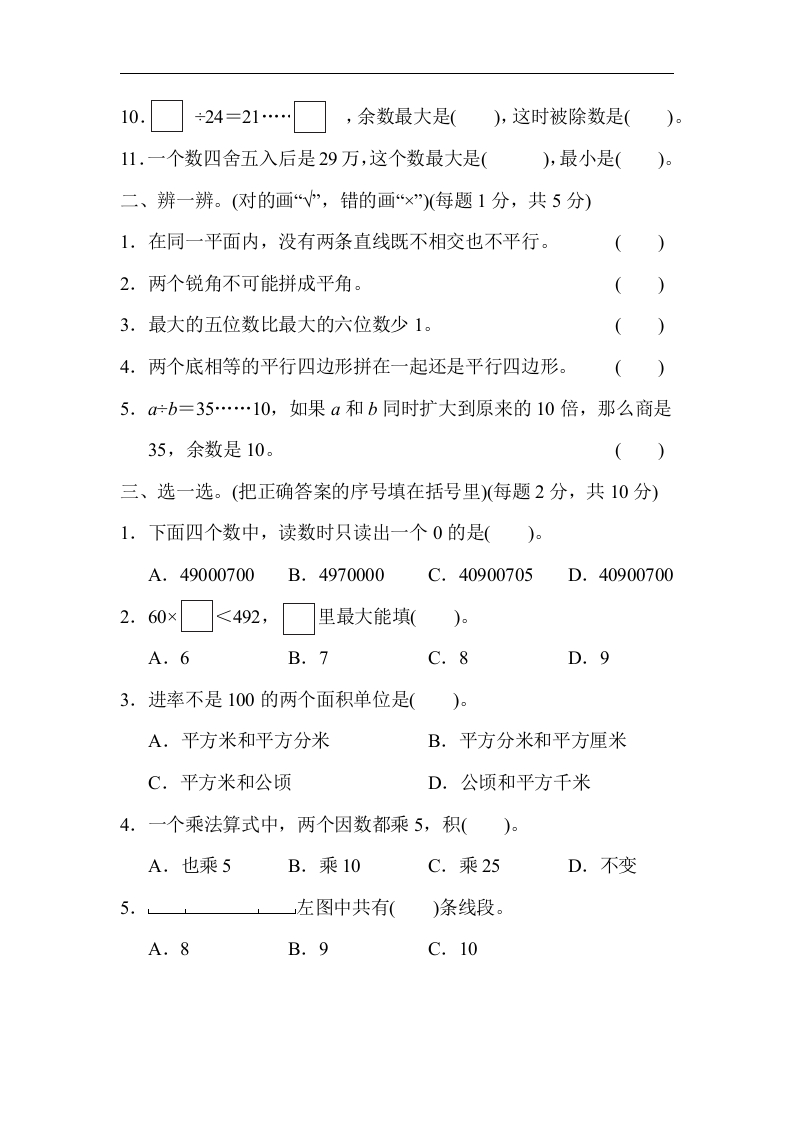 模块过关(四)常考、易错题综合能力冲刺检测卷一、填一填。(每题2分,共22分)1.“神舟十一号”宇宙飞船在太空中平均每小时飞行约二千八百万米。这个数写作(),把它改写成用“万”作单位的数是()2.40654007880这个数是由()个亿、()个万和(个一组成的。3.一块长方形的玉米地,长4千米,宽3千米,它的面积是()公顷。4.要使065÷58的商是两位数,口里最小能填():要使3o4÷36的商是一位数,口里最大能填()。5.商店开展促销活动。10元钱可以买3双袜子,150元钱可以买(双袜子。6.右图中,一共有()个平行四边形。7.199328≈200万,里可填的最小数字是(8.在6012=5中,如果除数除以2,要使商不变,那么被除数应该变为()。9.爸爸、妈妈和乐乐每人一个鸡蛋。一口锅每次最多只能煎两个鸡蛋,每面煎两分钟,两面都要煎,最少要()分钟全家人都能吃上煎蛋。