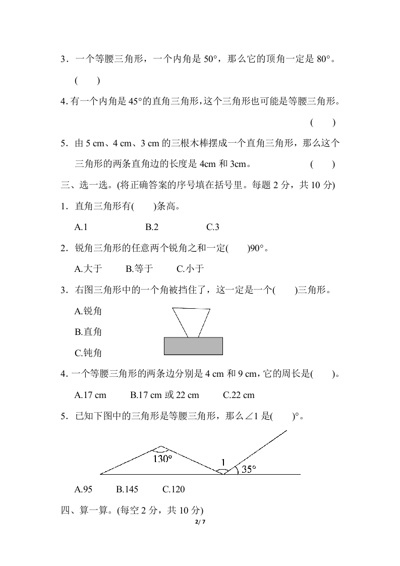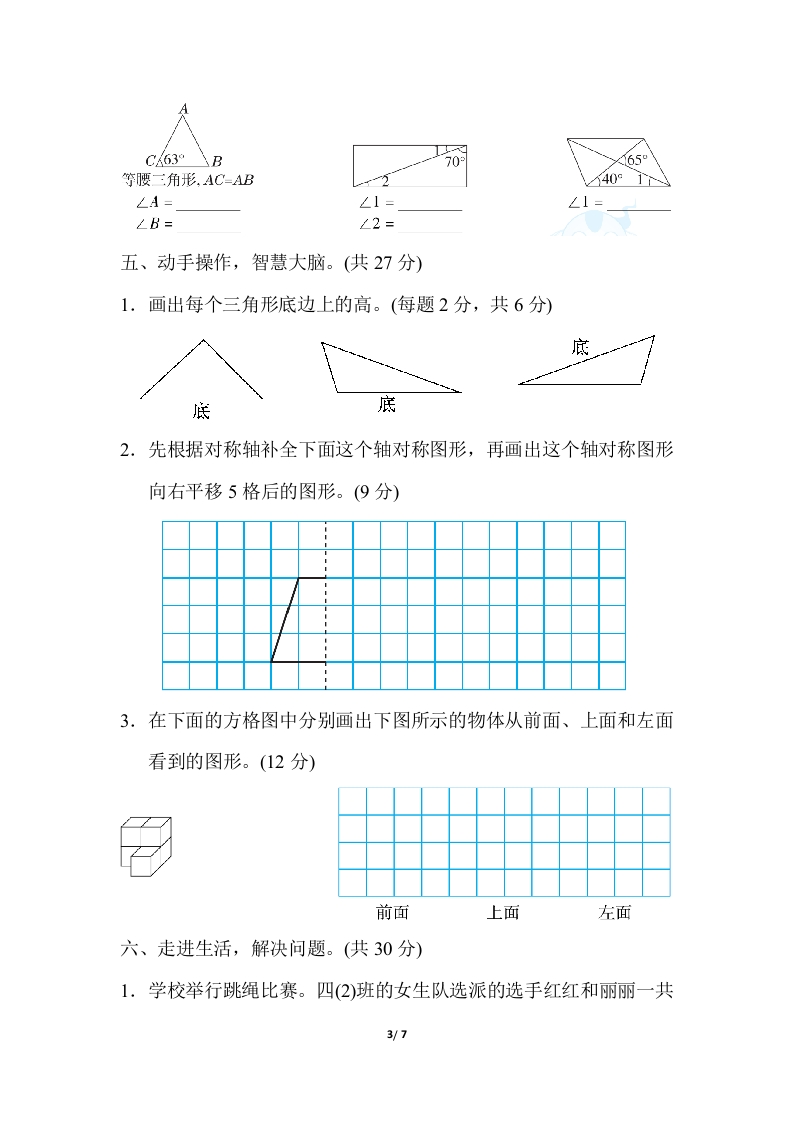 模块过关卷(二)几何与统计一、填一填。(每题2分,共18分)1.有一个角是60的等腰三角形一定是()三角形。2.任何一个三角形至少有()个锐角:但至多只有()个钝角或直角。3.四边形的内角和是()°,五边形的内角和是()°。4.把一根18cm长的铁丝折成一个等边三角形铁框,铁框一边长()cm,若折成一条腰是5cm的等腰三角形铁框,铁框底边长)cm。5配阴影部分占整个图形的《6.一个等腰三角形的底是15cm,腰是8cm,它的周长是()7.一条红领巾,它的顶角是100°,它的一个底角是()°。小鱼向()平移了()格。9.如果有一个三角形的两条边分别长8cm和10cm,那么另一条边可能是()cm。(长度取整厘米数)二、辨一辨。(对的在括号里打“V”,错的打“×”。每题1分,共5分)1.要统计四年级五个班男女生最喜欢的课程,可以制作单式统计图。()2.在等边三角形、平行四边形、正方形、圆中,对称轴最多的图形是圆,对称轴最少的图形是平行四边形。()1/7