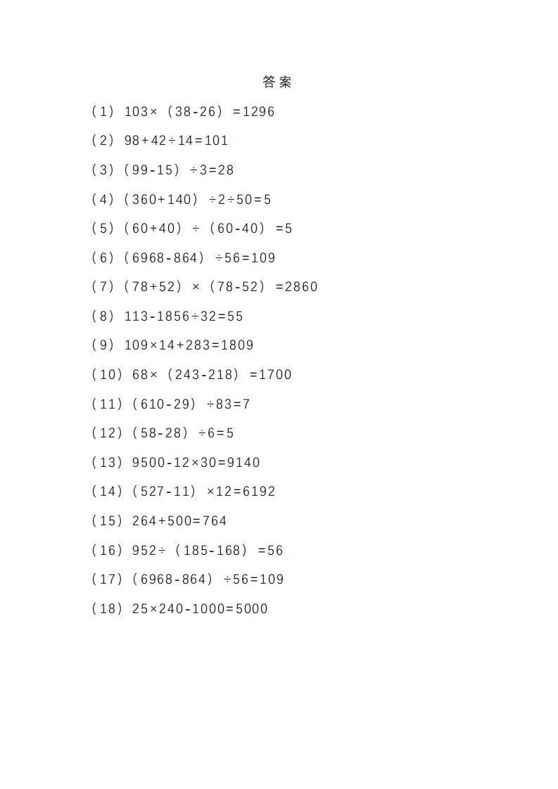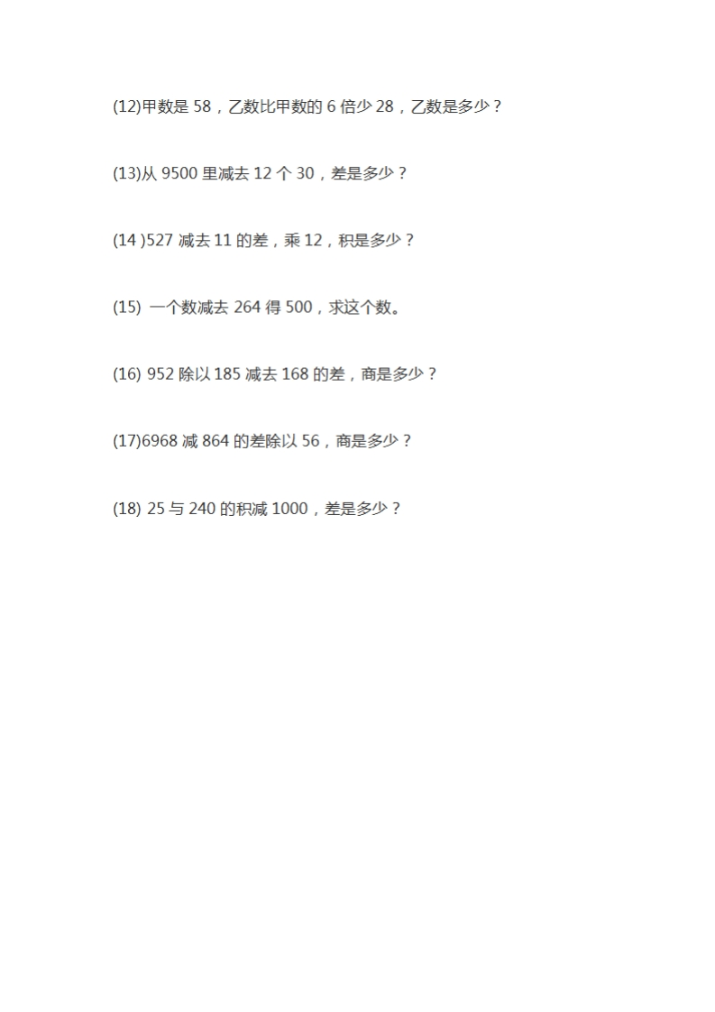 (1)103乘38减26的差,积是多少?(2)98加42除以14的商,和是多少?(3)甲数是99,比乙数的3倍多15,乙数是多少?(4)360与140的和的一半,再除以50,商是多少?(5)60与40的和,被它们的差除,结果是多少?(6)6968减去864的差除以56,商是多少?(7)78与52的和乘以它们的差,积是多少?(8)113减去1856除以32的商,差是多少?(9)109乘14,再加283,和是多少?(10)68乘243减218的差,积是多少?(11)83除610减29的差,商是多少?