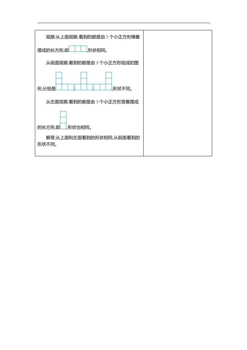 2观察物体(二)从不同位置观察到的物体的形状是不同的。判断从不同位置观察到的图形的方法:从哪一位置观察物体,就从哪一面数出小正方体的数量,并确定摆出导学点睛的形状。从前面观察,可以知道这个物体是由几列、几层摆成的;从上面观察,可以知道这个物体是由几列、几排摆成观察物体时,视线应垂直于所的从左、右面观察,可以知道这个物体是由几层、几排要观察的平面。摆成的。从左面和右面观察同一个物体,看到的形状不-定相同。易错题:如从前面、上面、左面观察下面的物体,分别是什么形状?判断:一个物体从左面看到的则这个物体一定是由4观察可知,这是由5个小正方体搭成的物体。从前面个小正方体摆成的。()看有两层,第一层有3个小正方形,第二层正中间有一个分析:组成物体的小正方体的个数不一定是4个,只能说至少是4个。单凭从某一个位置看到的图小正方形,即从上面看有前后两排,第一排有1形,是不能确定组成物体的小正方体的个数的。正确答案:×个小正方形,第二排有3个正方形,即从左面看有两列,第一列有1个正方形,第二列有2个正方形,即解答:前面上面左西二、从同一位置观察不同形状的物体,所看到的形状可能相同也可能不同。如观察下面的3个物体,从哪面看到的形状相同?从哪面看到的形状不同?图中给出的是由5个小正方体摆成的三个不同形状的物体,从上面、前面和左面进行观察,所看到的分别是什么形状的再判断相同与否。