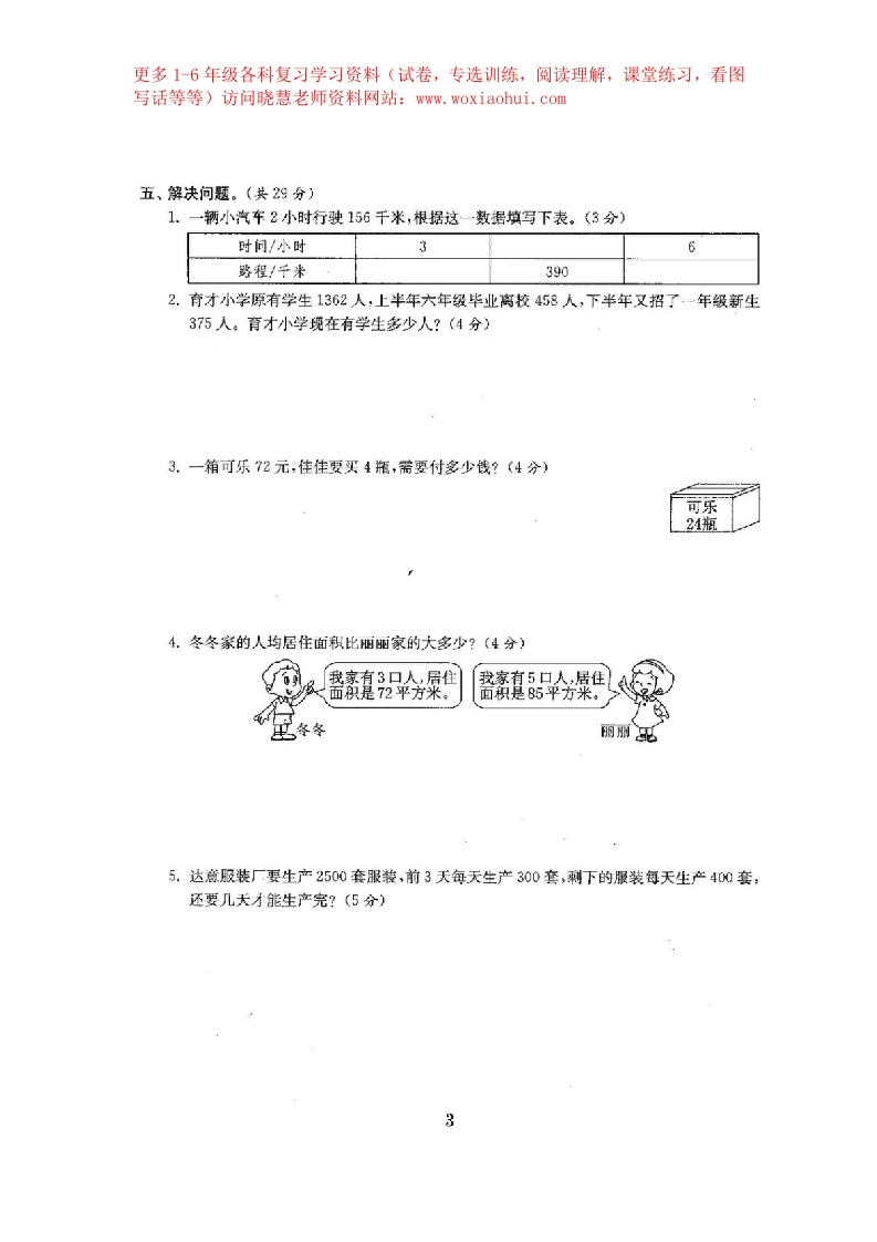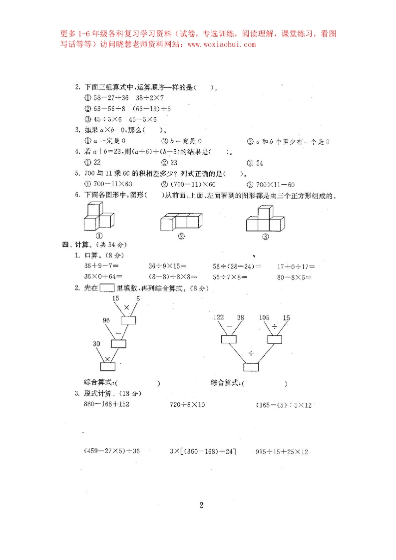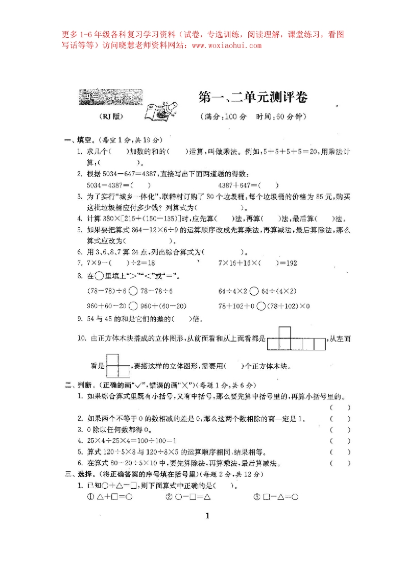 更多16年级各科复习学习资料(试卷,专选训练,阅读理解,课堂练习,看图写话等等)访问晓慧老师资料网站:www.woxiaohui.com第一、二单元测评卷(R版)(满分:100分时间:60分钟)一、填空。(每空1分,共19分)1.求几个()加数的和的()运算,叫做乘法。例如:5十5十5十5=20,用乘法计算:(。2.根据5034一647=4387,直接写出下面两道题的得数:5034-4387=()4387+647=()3.为了实行“城乡体化”,联群村订购了0个垃圾桶,每个垃圾桶的价格为85元,购买这批垃圾桶应付多少线?列算式为()4.计算380×[215+(150-135)]时,应先算()法,再算()法,最后算()法。5.如果要把算式864一12×6÷9的运算顺序改成先算乘法,再算减法,最后算除法,那么算式应改为(6.用3,6、8、7算24点,列出综合算式为()。7.7×9-()÷2=187×15+16×()=1928.在○里填上“>“<”或“=”(78-78)÷6○78-78÷664÷4×2○64÷(4×2)960+60-20○960+(60-20)78+102+0(○(78+102)×09.54与45的和是它们的差的()倍。10.由正方体木块搭成的立体图形,从前面看和从上面看都是从左面看是要搭这样的立体图形,需要用()个正方体木块。二、判断。(正确的画“√/”,错误的画“X”)(每题1分,共6分)1.如果综合算式里既有小括号,又有中括号,那么要先算中括号里的,再算小括号里的。2.如果两个不等于0的数相诚的差是0,那么这两个数相除的离一定是1。3.0除以任何数都得0。4.25×4÷25×4=100÷100=1)5.算式120:5×8与120÷8×5的运算顺序相同,结果相等。6.在算式8020÷5×10中,要先算除法,再算乘法,最后算减法。三、选择。(将正确答案的序号填在括号里)(每题2分,共12分)1.已知○十△=口,则下面算式中正确的是(①△+口=C②0-口-△③☐-△-○1