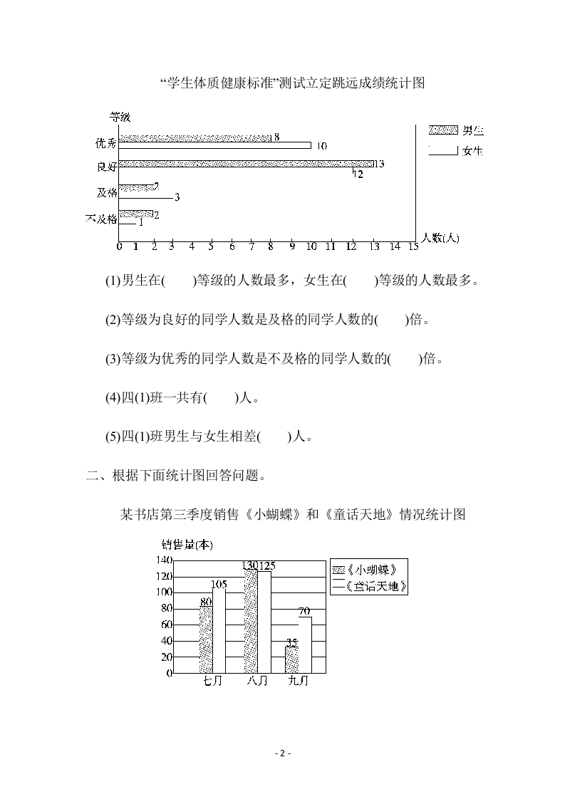 第七单元检测卷及答案一、填空。1.丰收路小学各年级获得纪律、卫生流动红旗的次数如下图:4获得1旗饮数(次)翻纪律口卫牛161614-1212-1010-8-4-2-0五r布级(1)0)年级获得纪律流动红旗的次数最多,是()次。(2)()年级获得纪律流动红旗的次数最少,是()次。(3)()年级获得卫生流动红旗的次数最多,是()次。(4)0)年级获得卫生流动红旗的次数最少,是()次。2,下面是四(1)班同学参加“学生体质健康标准”测试中立定跳远测试成绩统计图。-1-